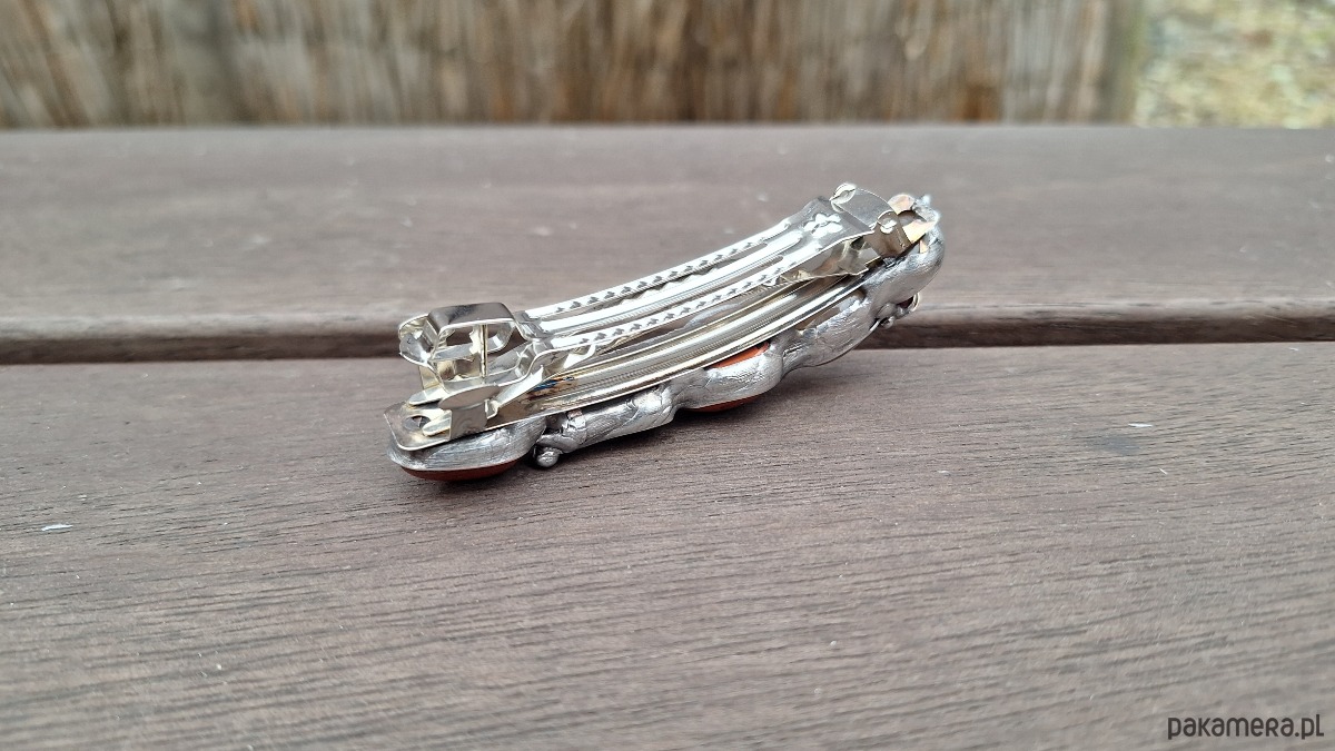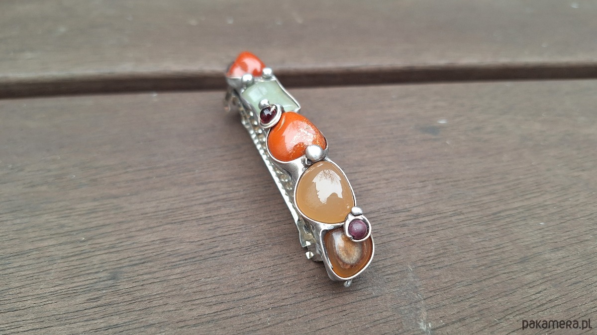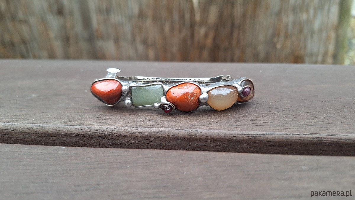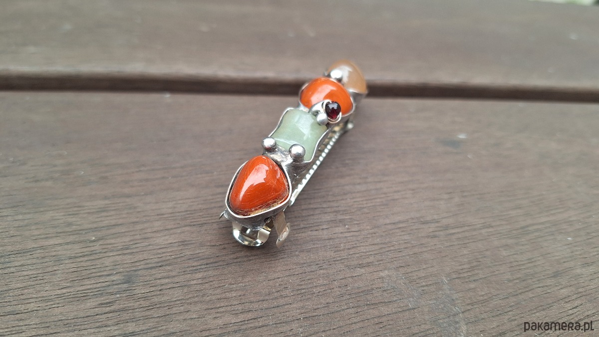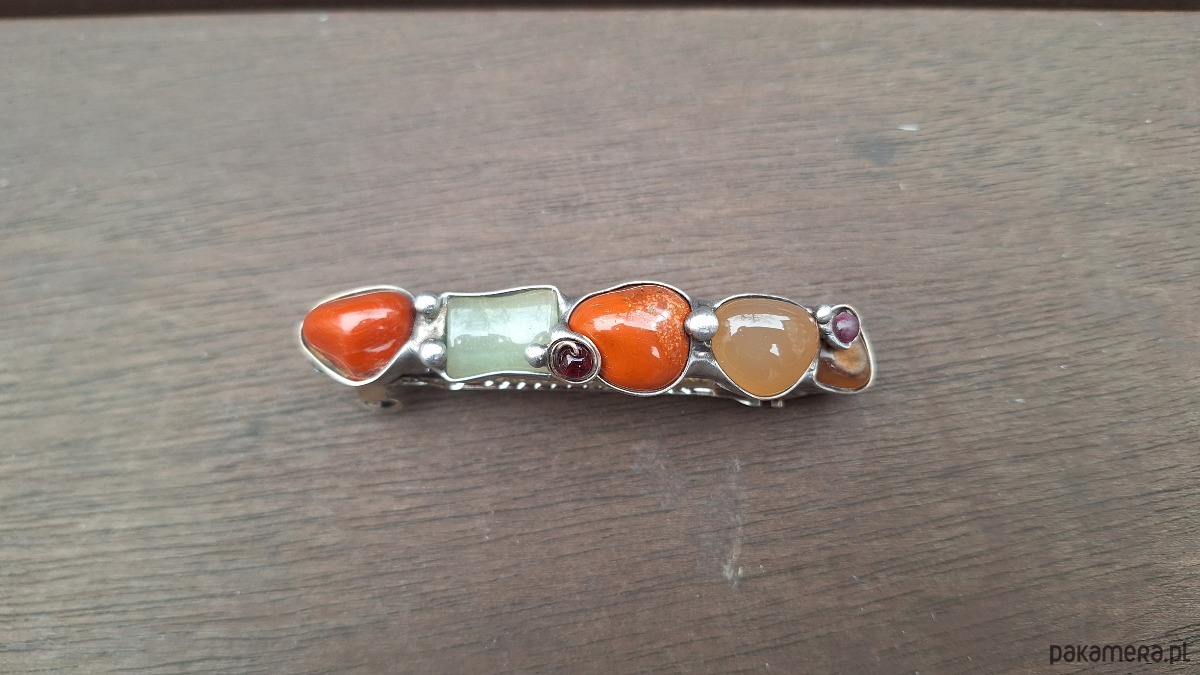 Klamra do włosów, wykonana z miedzi, cyny, granatów, jaspisów i agatów. Wymiary ok. 8 na 1.5 cm. Zapięcie 6 cm, metalowe.
