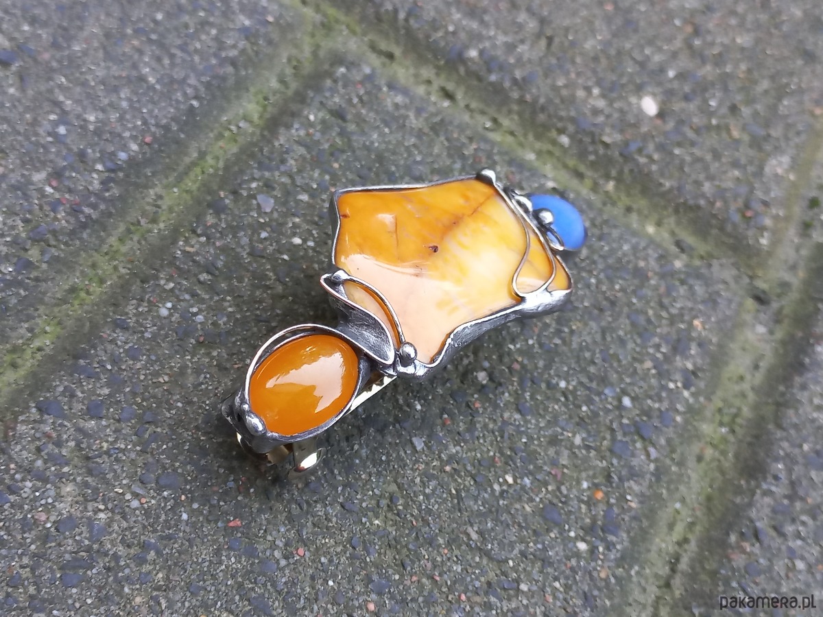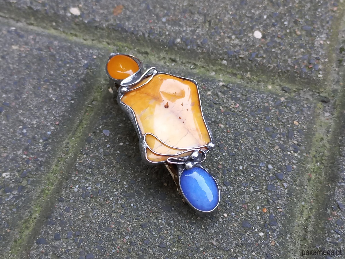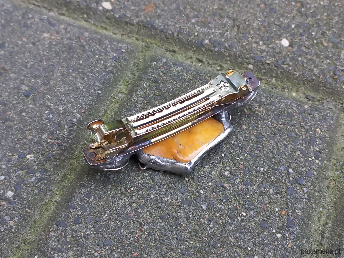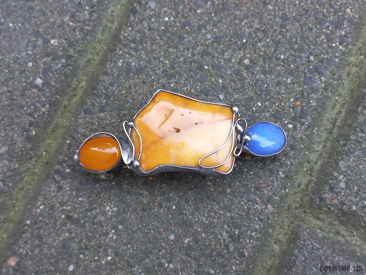 Klamra do włosów, wykonana z miedzi, cyny, jaspisu i jadeitów. Metalowe, automatyczne zapięcie. Wymiary ok. 8 na 3 cm.