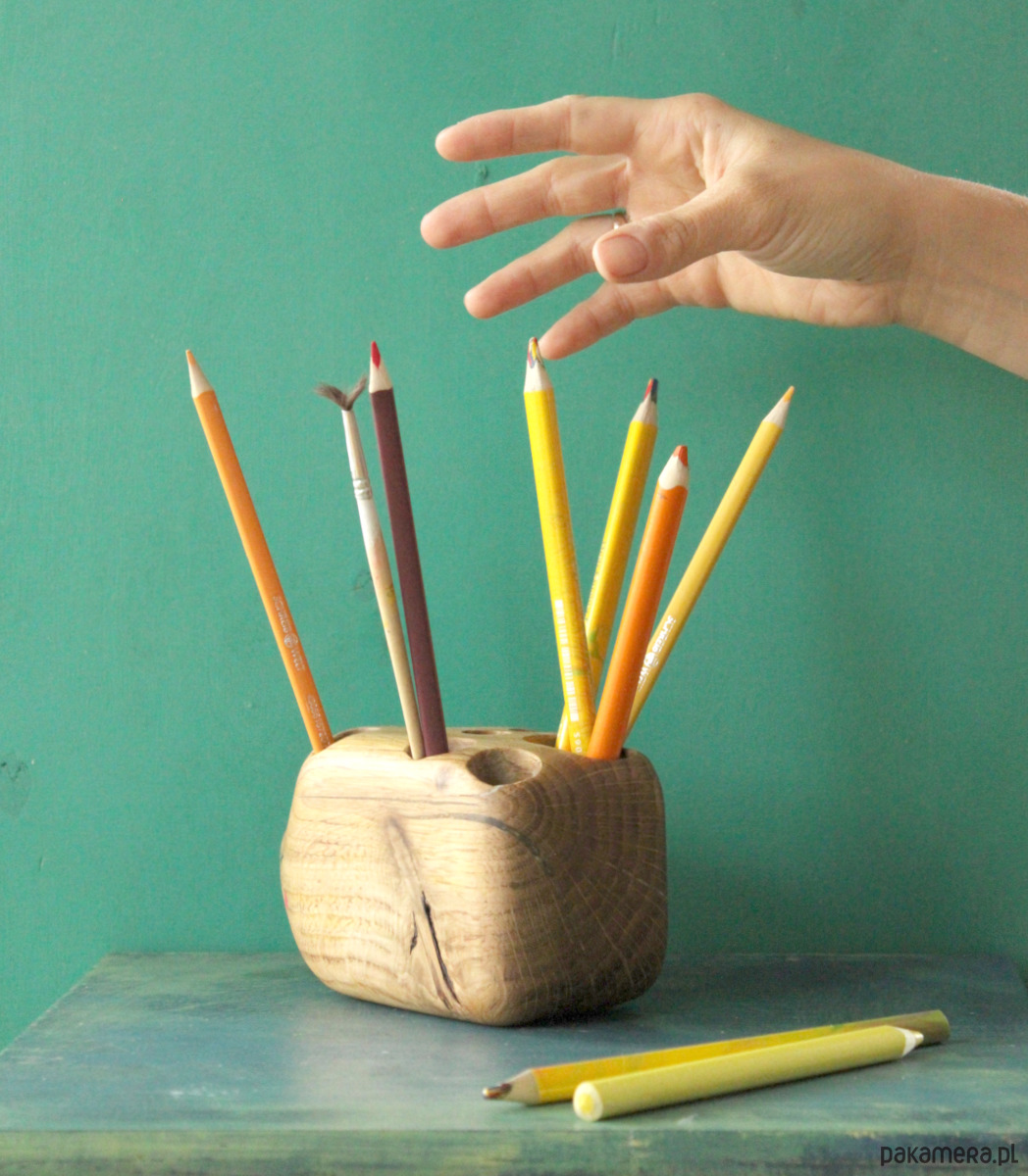 Nasze sortery robimy ręcznie, z drewna dębowego z drugiego obiegu. W zamian za ratunek od nieuchronnej śmierci w kominku odwdzięcza nam się ono niepowtarzalnymi odcieniami, wyrazistymi słojami i przepięknymi sękami. Ze względu na to, każdy z naszych przyborników jest nieco inny – to jest właśnie w nich najpiękniejsze.