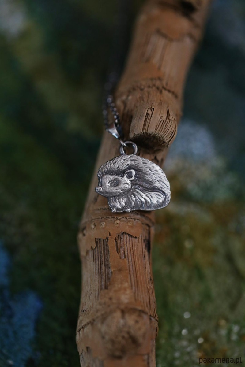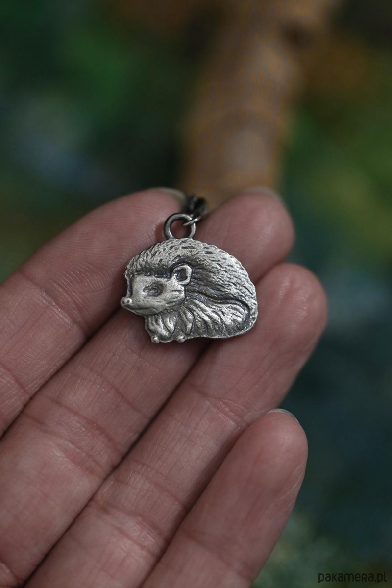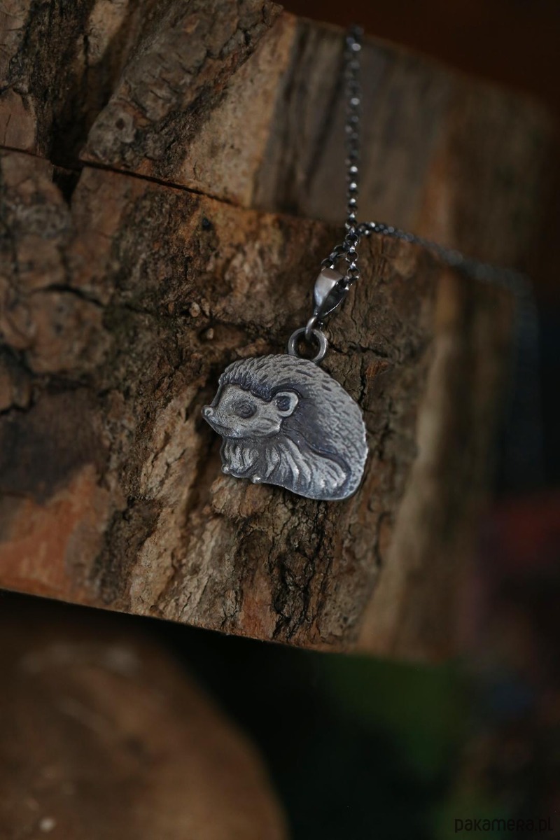 Jeż jest jednym ze zwierzaków spod znaku marki Cztery Humory. Wisiorek powstał według autorskiego projektu. Srebro pokryto oksydą, nadającą mu stalowo - szary odcień i przetarto dla wydobycia szczegółów zawieszki.
