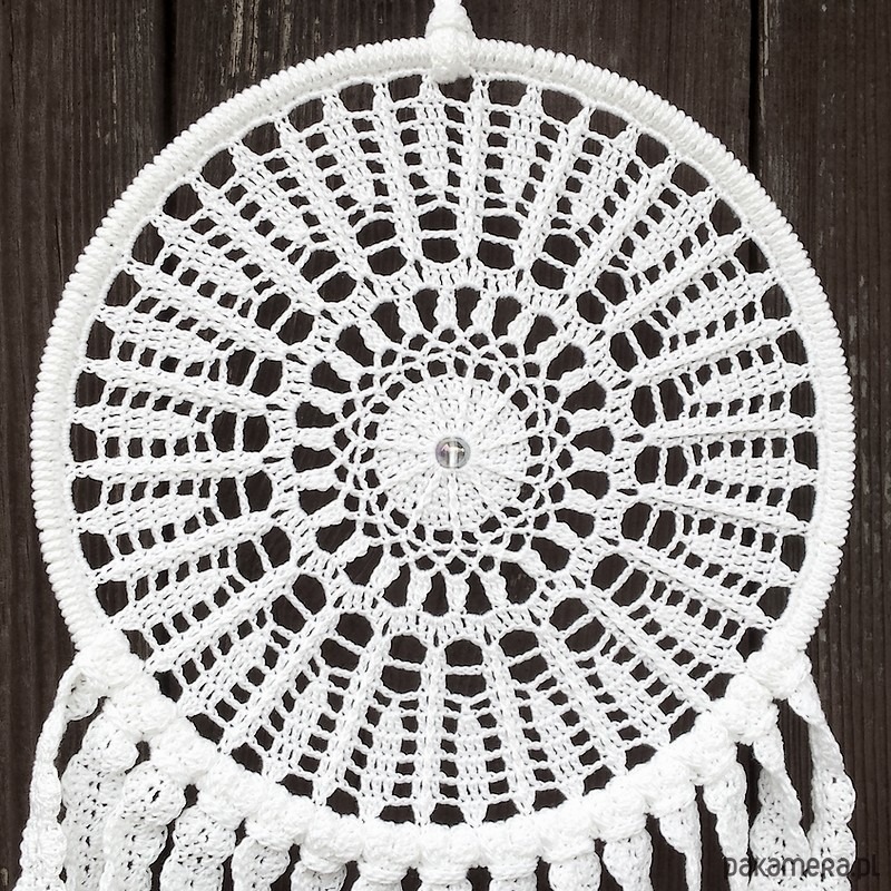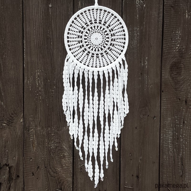 Biały łapacz snów Joana powstał z zaprojektowanej przeze mnie serwetki. Ozdobiłam go szydełkowymi koronkami i szklanymi koralikami. Wszystkie elementy łapacza stworzyłam ręcznie z dbałością o najdrobniejszy szczegół.