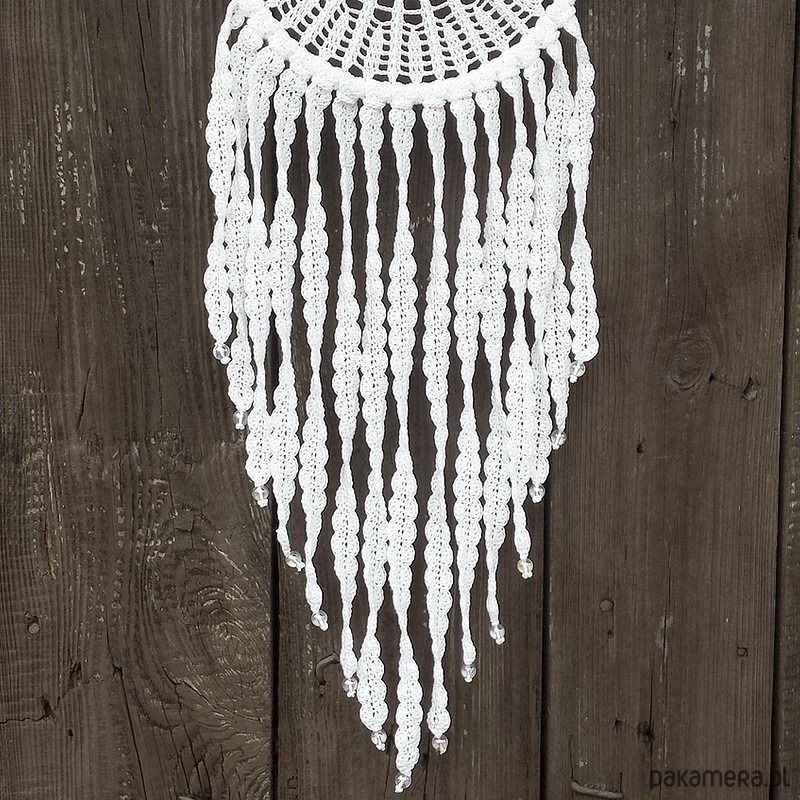 Łapacz snów wykonany jest z merceryzowanej bawełny. Serwetka została napięta na metalowej obręczy. Zawieszka oraz koronki są zdejmowane. Szklane koraliki mienią się i odbijają światło nadając całej ozdobie lekkości.