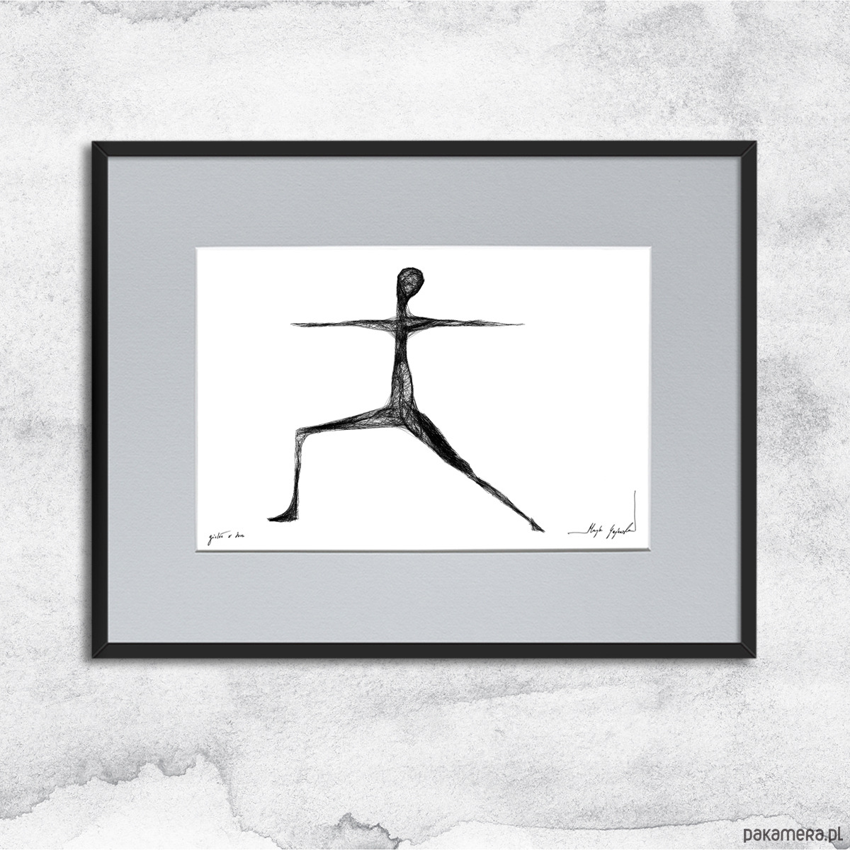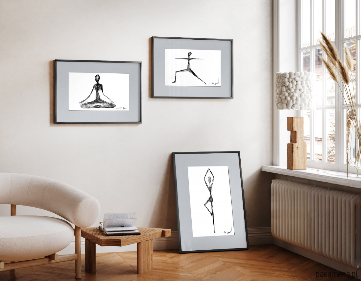 Grafika artystyczna została wykonana techniką mieszaną (giclée + rysunek isografem) na białym, matowym, o lekko fakturowanej powierzchni graficznym papierze Canson 250g. W zaprezentowanym cyklu znajdują się minimalistyczne grafiki dla miłośników jogi. Przedstawiają spokój i równowagę. Czarno-białe, artystyczne grafiki o prostej formie i linii, koncentrują się na kluczowych aspektach wybranej pozycji jogowej. Idealnie wkomponują się we współczesne wnętrza z dodatkami bieli, szarości czy grafitu. Czarno-białe grafiki z asanami pasują na ścianę do sypialni lub kobiecego gabinetu.
