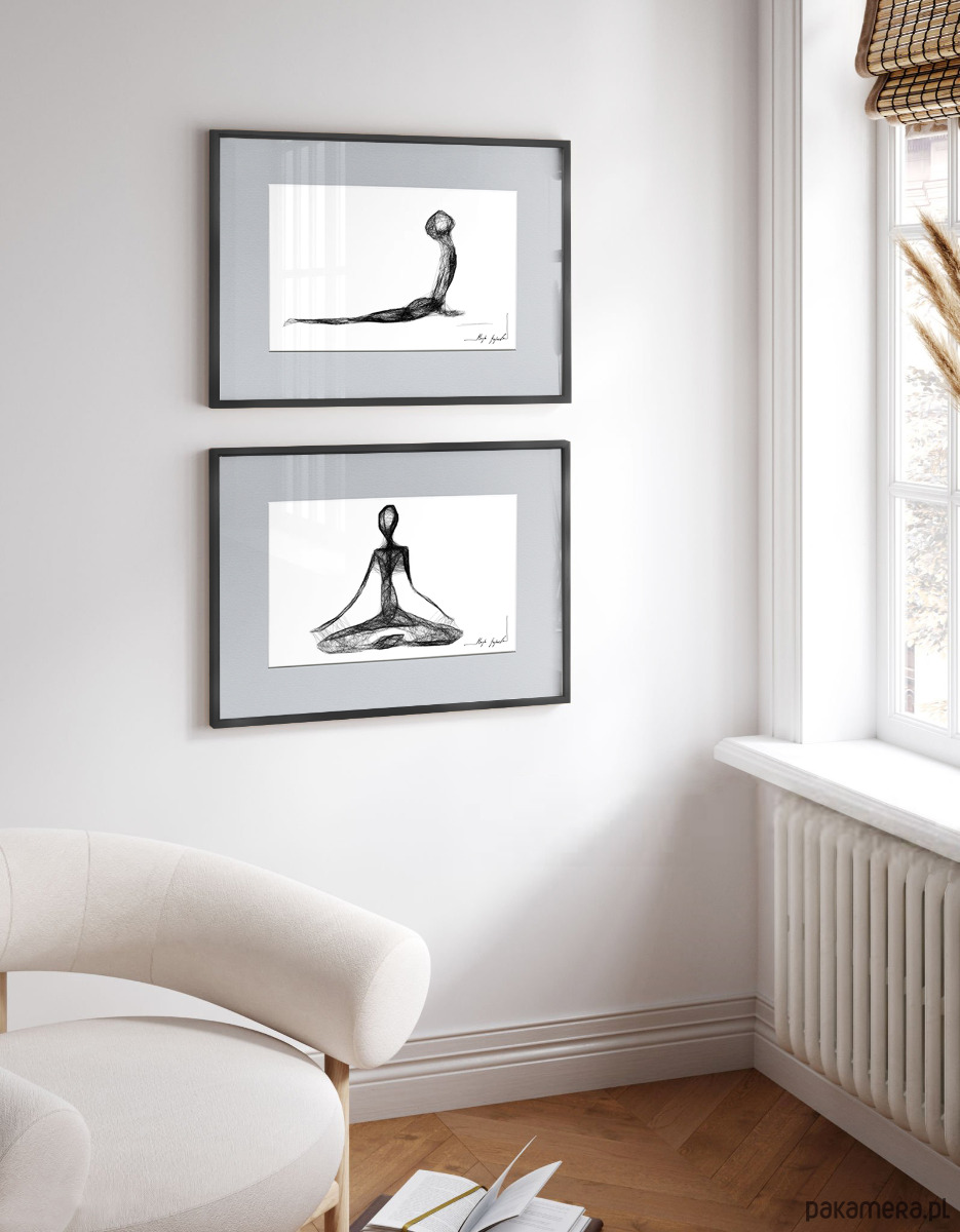 Grafika artystyczna została wykonana techniką mieszaną (giclée + rysunek isografem) na białym, matowym, o lekko fakturowanej powierzchni graficznym papierze Canson 250g. W zaprezentowanym cyklu znajdują się minimalistyczne grafiki dla miłośników jogi. Przedstawiają spokój i równowagę. Czarno-białe, artystyczne grafiki o prostej formie i linii, koncentrują się na kluczowych aspektach wybranej pozycji jogowej. Idealnie wkomponują się we współczesne wnętrza z dodatkami bieli, szarości czy grafitu. Czarno-białe grafiki z asanami pasują na ścianę do sypialni lub kobiecego gabinetu.