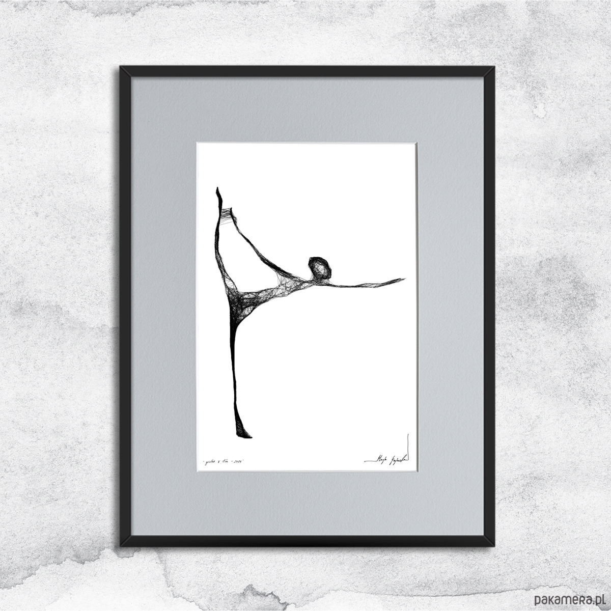 Grafika artystyczna została wykonana techniką mieszaną (giclée + rysunek isografem) na białym, matowym, o lekko fakturowanej powierzchni graficznym papierze Canson 250g. W zaprezentowanym cyklu znajdują się minimalistyczne grafiki dla miłośników jogi. Przedstawiają spokój i równowagę. Czarno-białe, artystyczne grafiki o prostej formie i linii, koncentrują się na kluczowych aspektach wybranej pozycji jogowej. Idealnie wkomponują się we współczesne wnętrza z dodatkami bieli, szarości czy grafitu. Czarno-białe grafiki z asanami pasują na ścianę do sypialni lub kobiecego gabinetu.