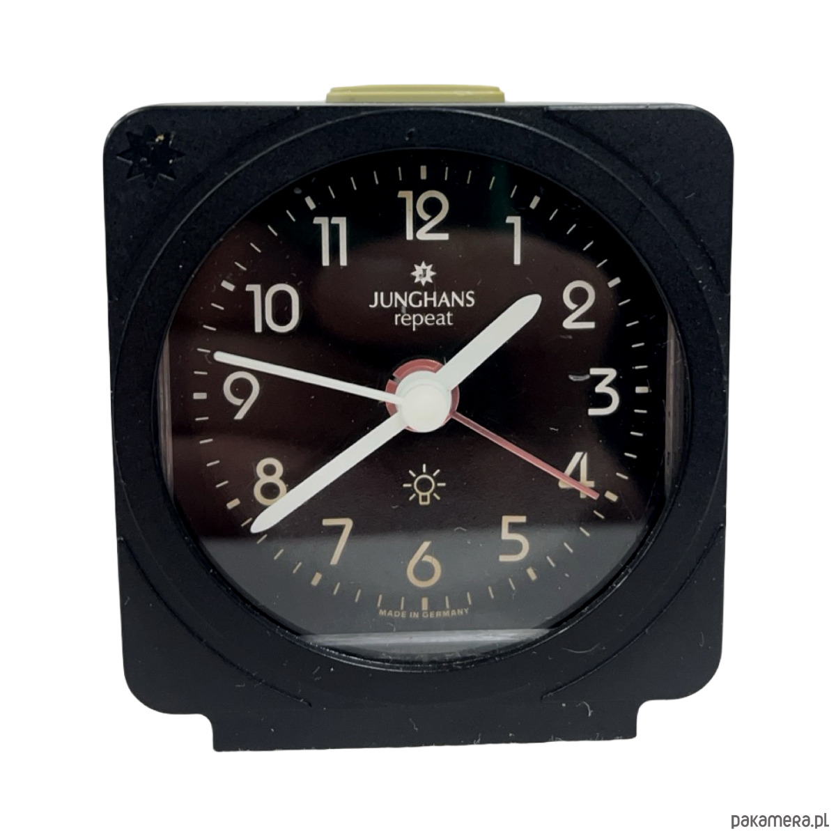 Kolekcjonerski budzik Junghans Repeat, renomowanej niemieckiej manufaktury zegarmistrzowskiej. Obudowa w kolorze czarnym, o geometrycznej, modernistycznej formie, kontrastuje z ciemną tarczą w odcieniu grafitowo-brązowym. Jasne, wyraźne cyfry oraz wskazówki zapewniają doskonałą czytelność. Model wyposażony w funkcję repeat (powtórzenie alarmu) oraz podświetlenie tarczy, co było charakterystyczne dla wysokiej klasy budzików z II połowy XX wieku. Mechanizm kwarcowy gwarantuje precyzję chodu. Przedmiot poszukiwany przez kolekcjonerów niemieckiego designu użytkowego i marki Junghans.