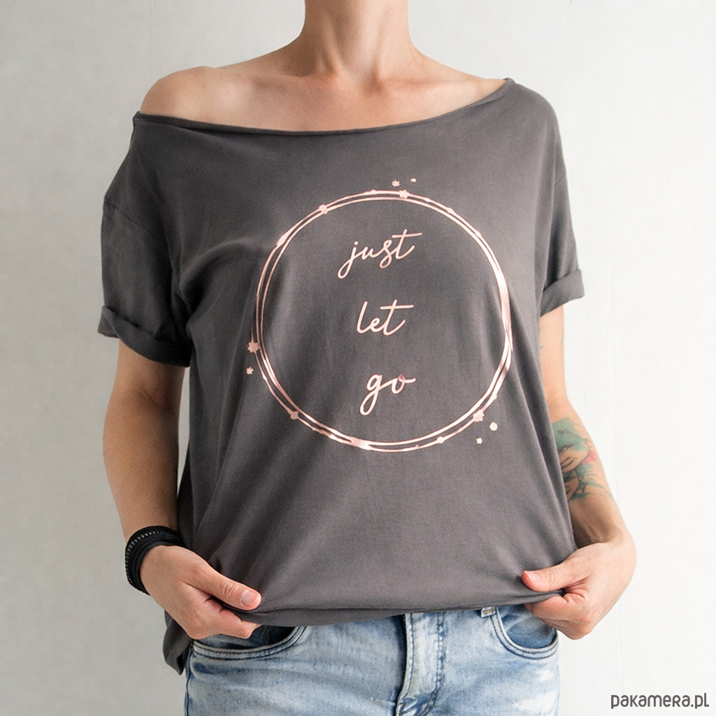 Koszulka w odcieniu szarej czekolady (coś pomiędzy brązem a szarością) z nadrukiem "Just let go" w odcieniu różowego złota.