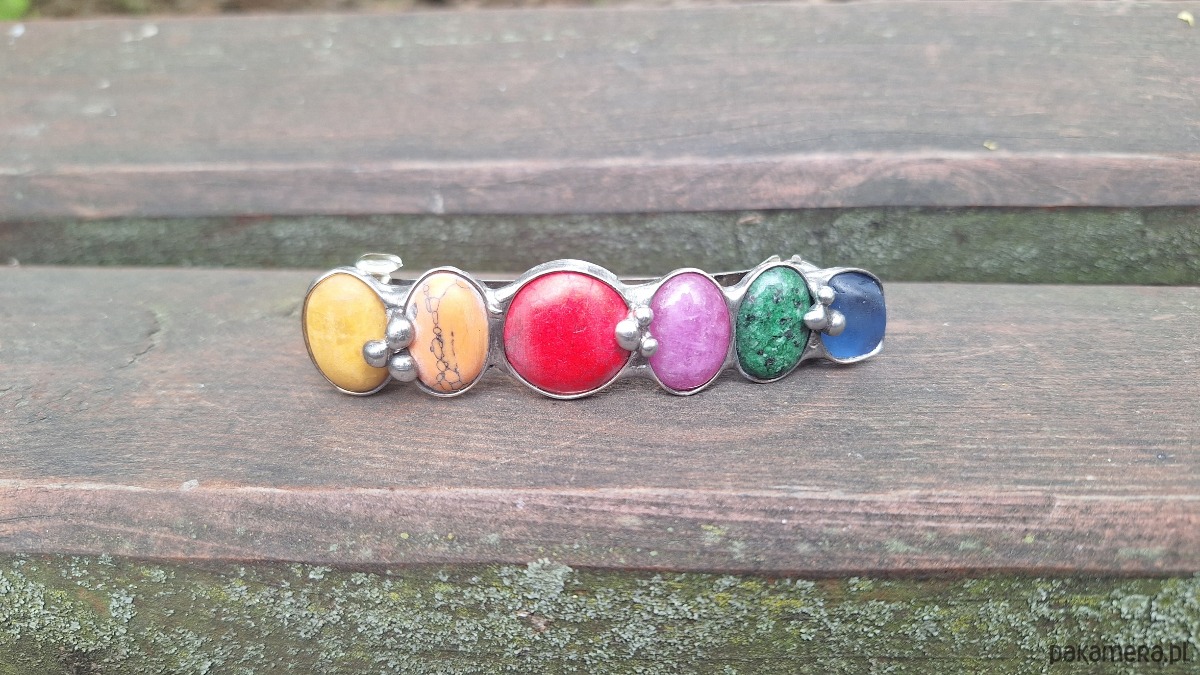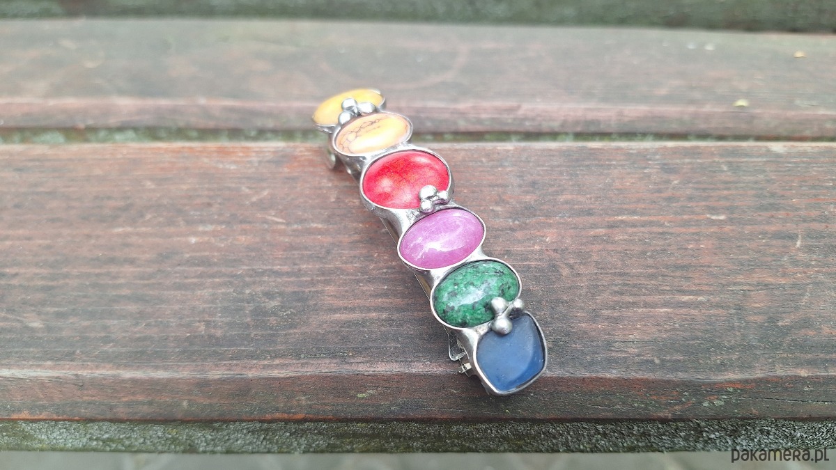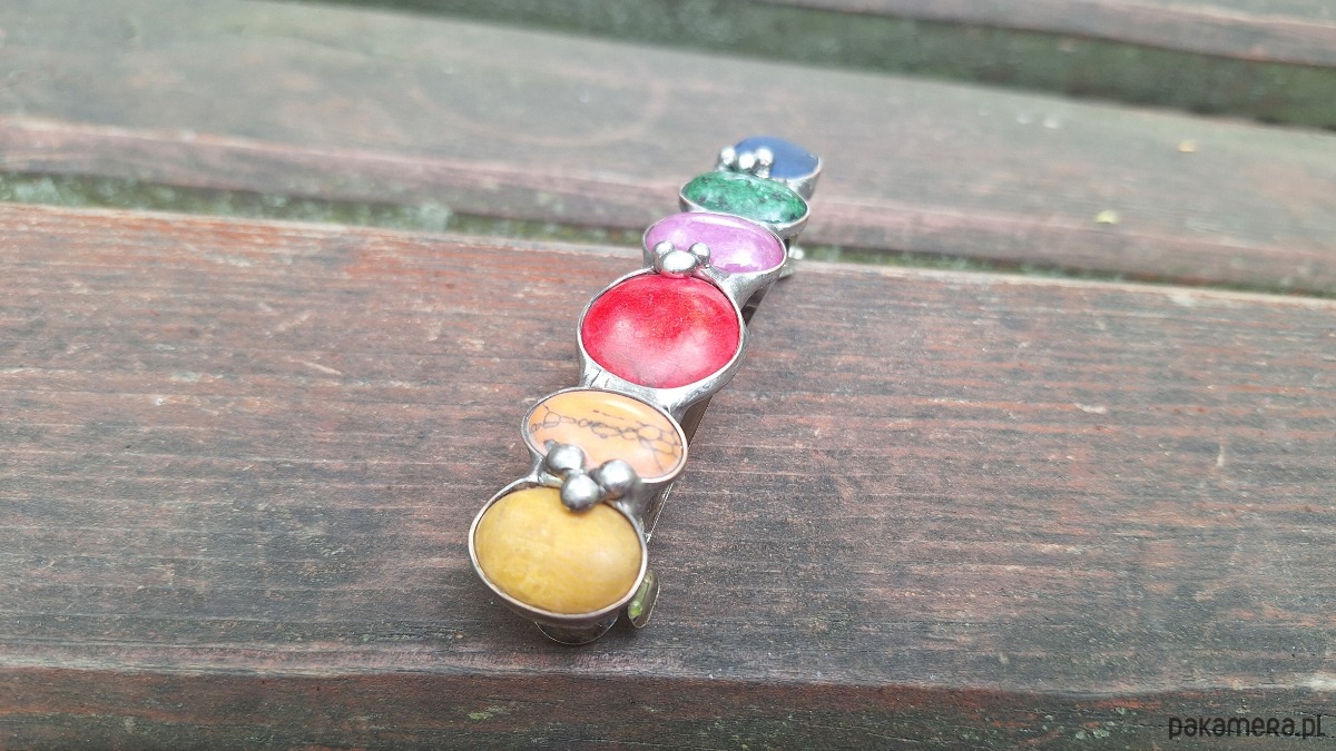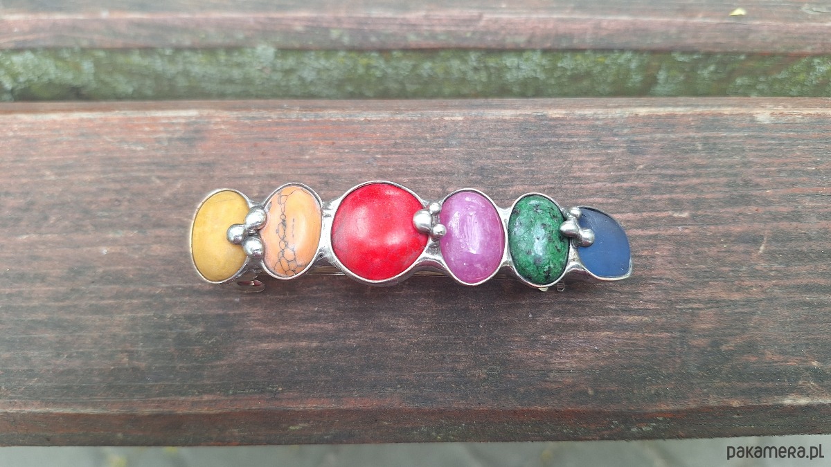 Klamra do włosów, wykonana z miedzi, cyny, howlitu, zoisytu, szkła, jaspisu i jadeitu. Metalowe, automatyczne zapięcie. Wymiary ok. 8 na 2 cm. Zapięcie ok. 6 cm.