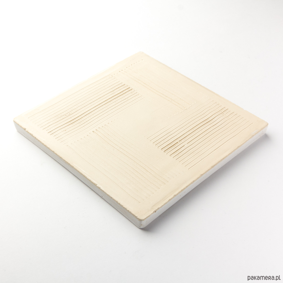 Ceramiczny, ścienny kafel z lekko wypukłym, misternym ornamentem. Ręcznie wykonany z jasnej gliny. Pokryty błyszczącym białym szkliwem. Odporny na wodę, ścieranie, wysokie i niskie temperatury. Montaż taki jak kafli standardowych.