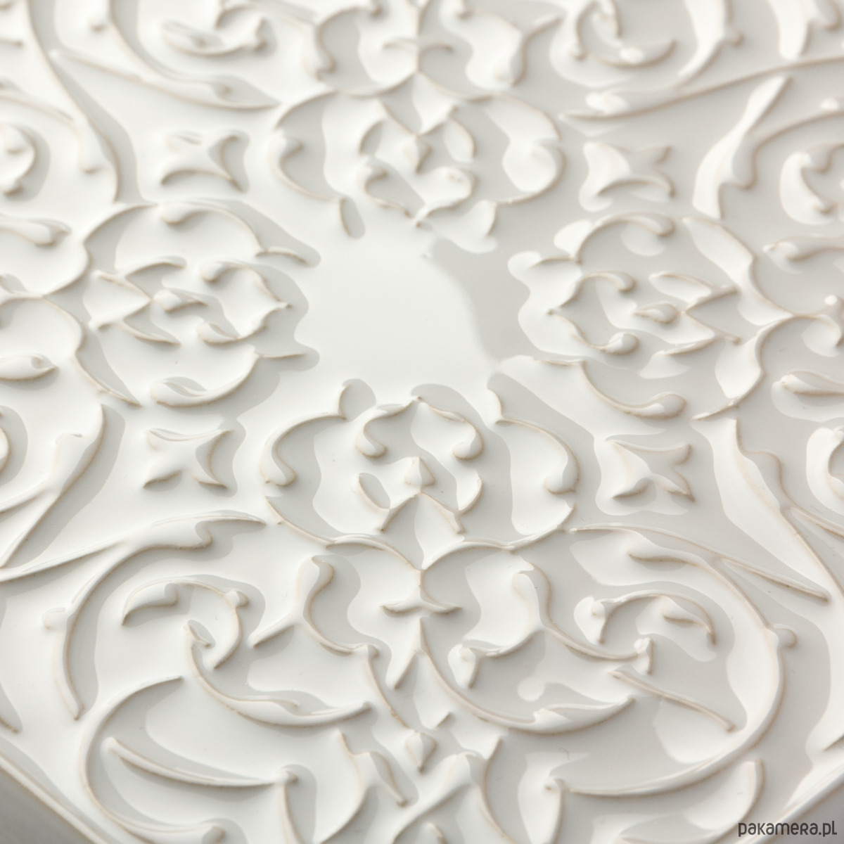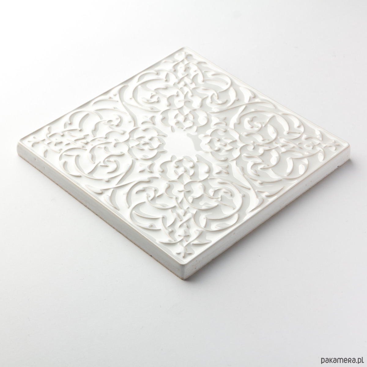 Ceramiczny, ścienny kafel z lekko wypukłym, misternym ornamentem. Ręcznie wykonany z jasnej gliny. Pokryty błyszczącym białym szkliwem. Odporny na wodę, ścieranie, wysokie i niskie temperatury. Montaż taki jak kafli standardowych.
