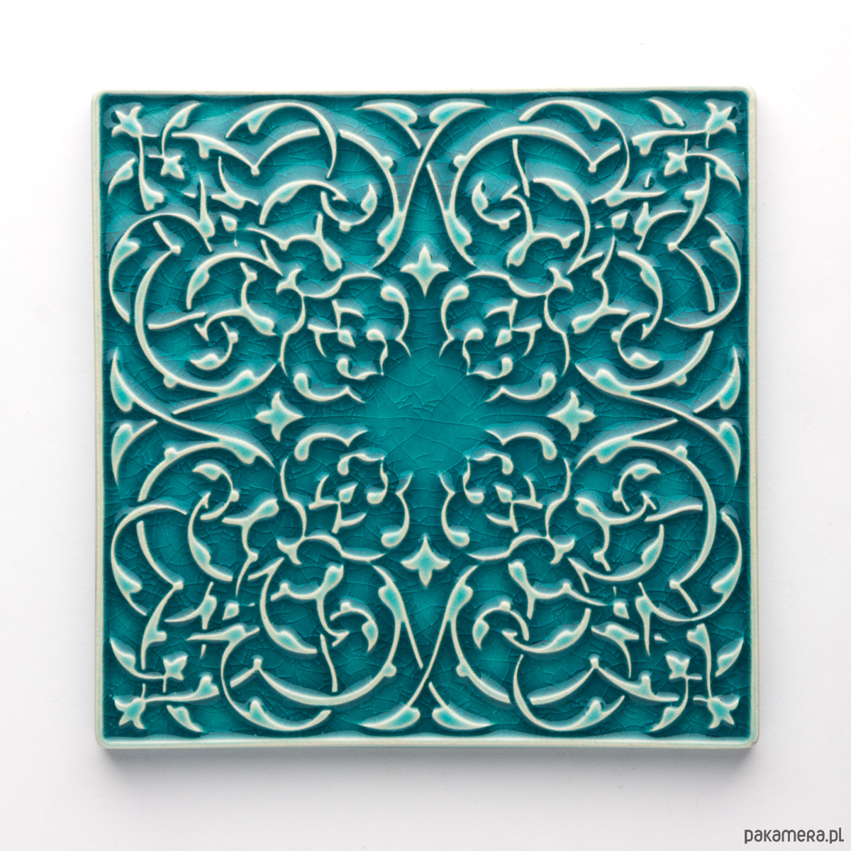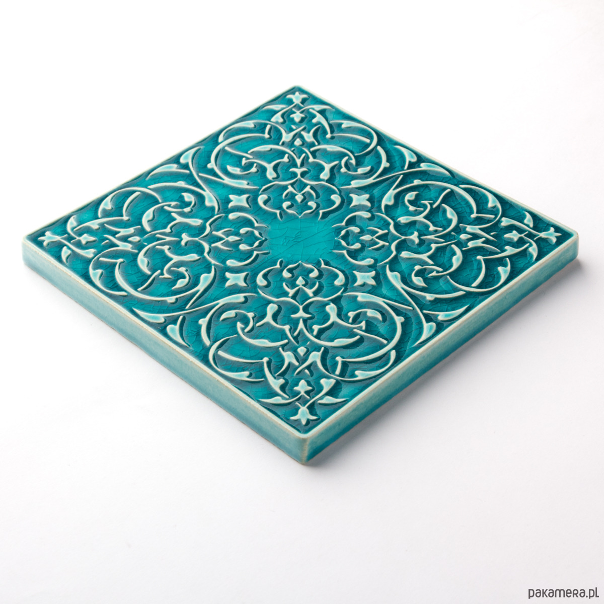 Ceramiczny, ścienny kafel z lekko wypukłym, misternym ornamentem. Ręcznie wykonany z jasnej gliny. Pokryty błyszczącym turkusowym szkliwem. Odporny na wodę, ścieranie, wysokie i niskie temperatury. Montaż taki jak kafli standardowych. Polecam serdecznie.