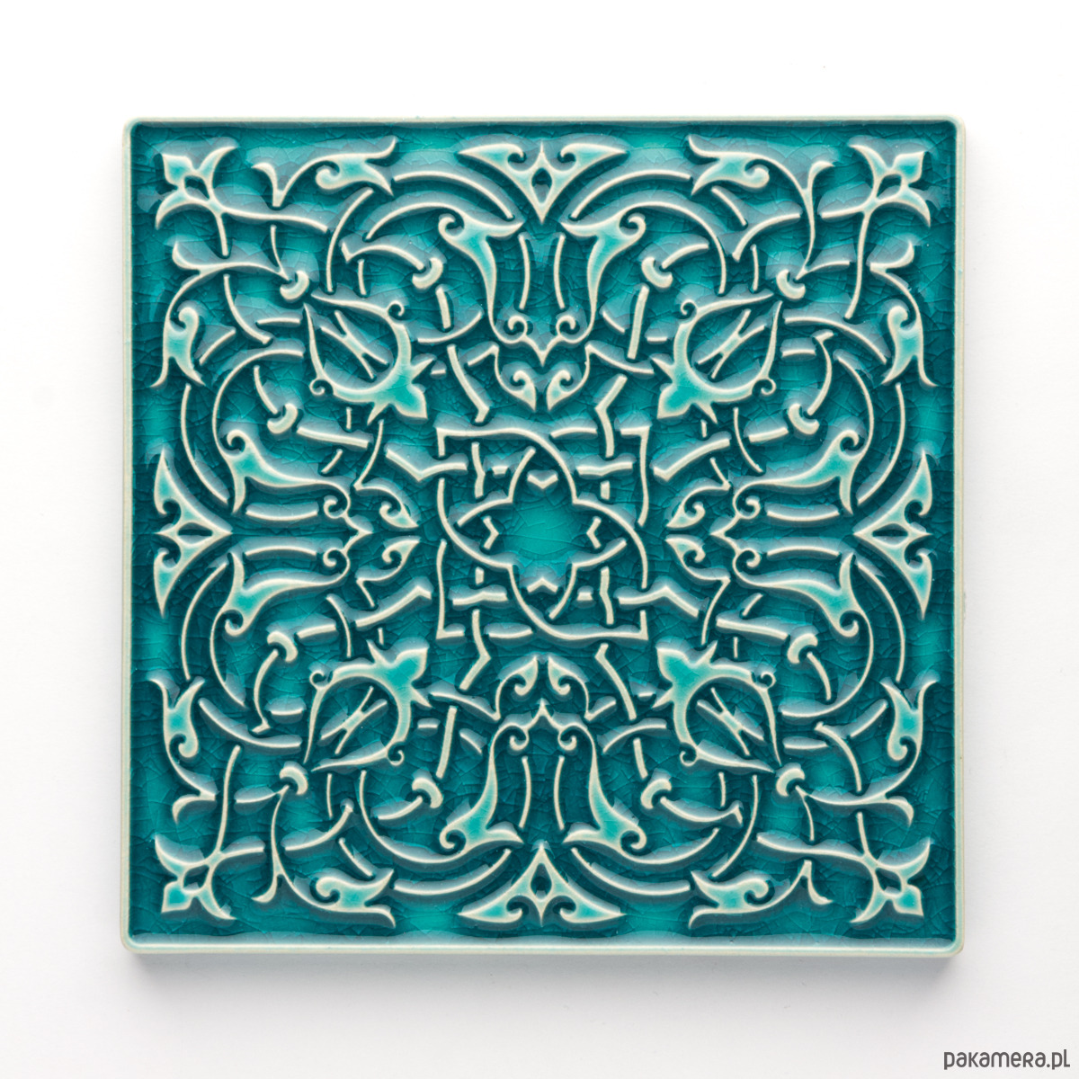 Ceramiczny, ścienny kafel z lekko wypukłym, misternym ornamentem. Ręcznie wykonany z jasnej gliny. Pokryty błyszczącym turkusowym szkliwem. Odporny na wodę, ścieranie, wysokie i niskie temperatury. Montaż taki jak kafli standardowych. Polecam serdecznie.