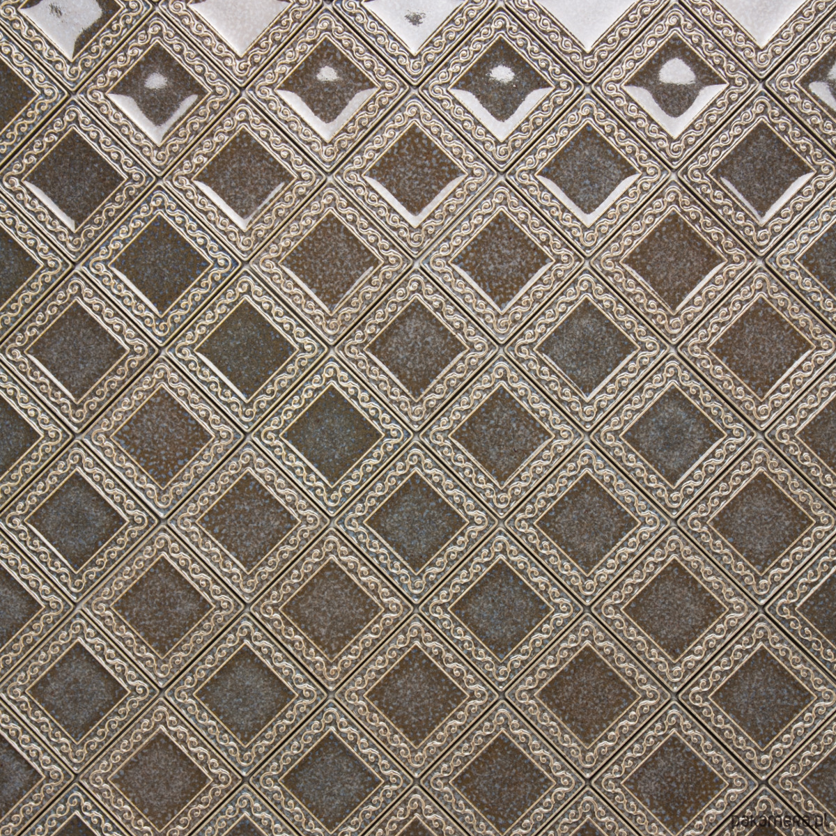 Kafle ceramiczne ręcznie robione, ścienne z lekko wypukłymi ornamentami. Ręcznie wykonane z jasnej gliny i ręcznie szkliwione w sposób który odpowiednio podkreśla ozdobny wzór wypukłego ornamentu. Dwukrotnie wypalane w wysokiej temperaturze. Odporne na wodę, ścieranie, wysokie i niskie temperatury. Montaż kafli standardowy.