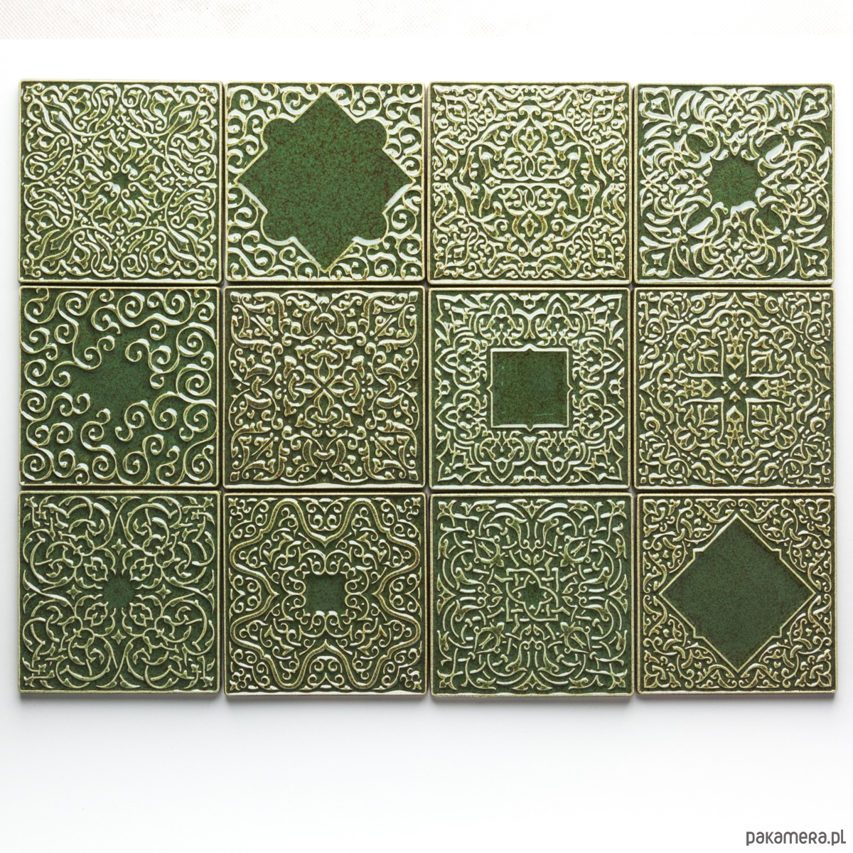 Kafle dwanaście ornamentów, zielonobrązowe.
