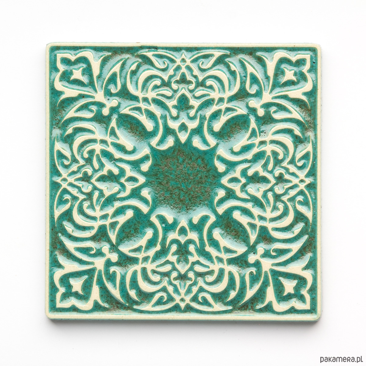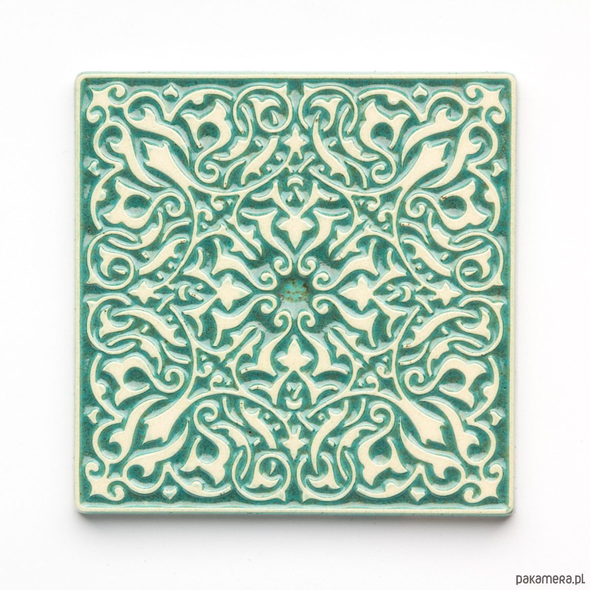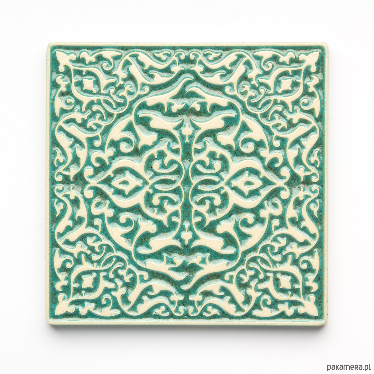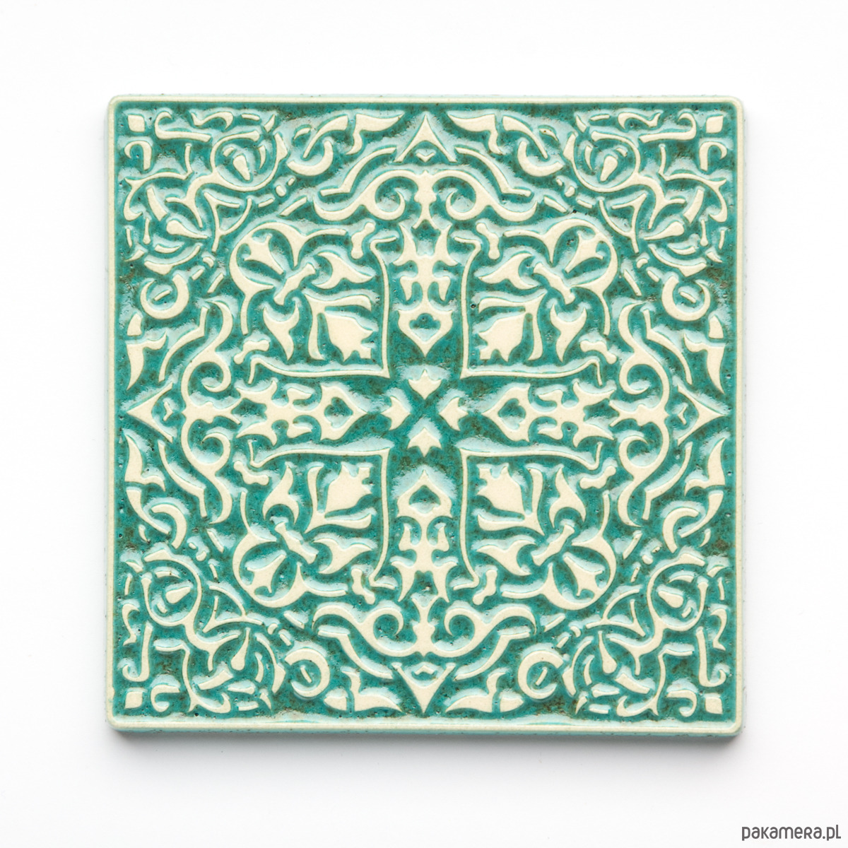 Kafle ceramiczne ręcznie robione, ścienne z lekko wypukłymi, misternymi ornamentami. Wykonane z jasnej gliny. Pokryte satynowym szkliwem, w sposób który odpowiednio podkreśla ozdobny wzór arabeskowej powierzchni. Dwukrotnie wypalane. Odporne na wodę, ścieranie, wysokie i niskie temperatury. Montaż kafli standardowy. Na zamówienie istnieje możliwość wykonania większej ilości podobnych.