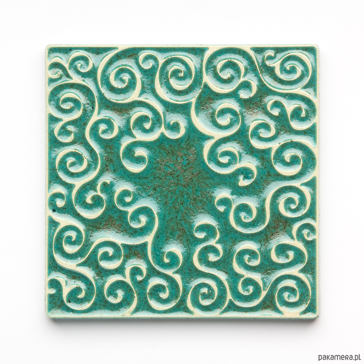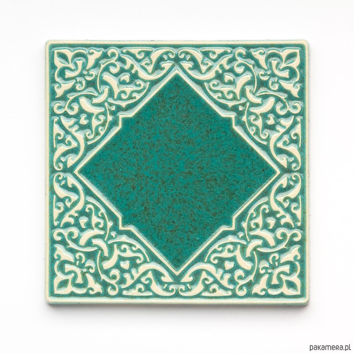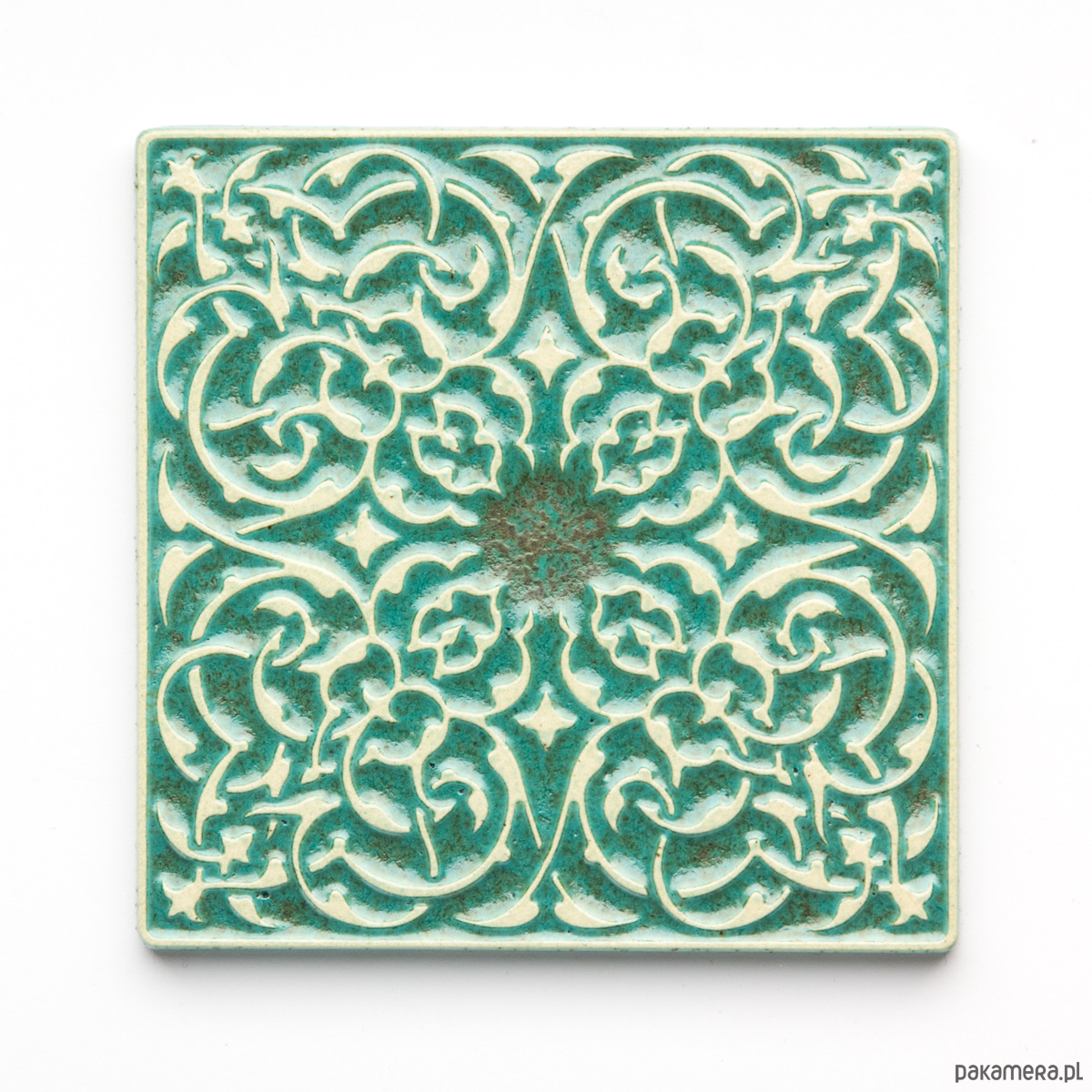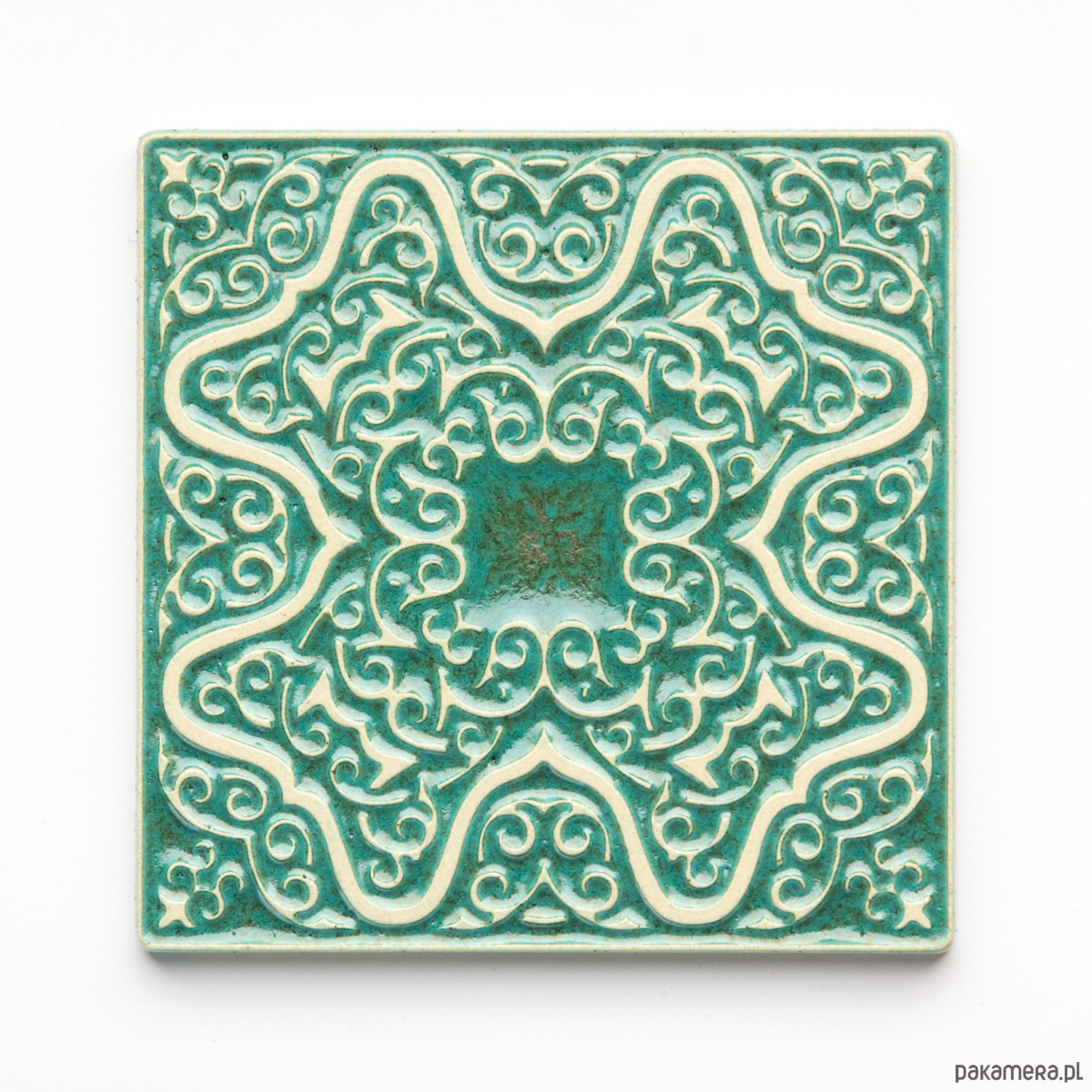 Kafle ceramiczne ręcznie robione, ścienne z lekko wypukłymi, misternymi ornamentami. Wykonane z jasnej gliny. Pokryte satynowym szkliwem, w sposób który odpowiednio podkreśla ozdobny wzór arabeskowej powierzchni. Dwukrotnie wypalane. Odporne na wodę, ścieranie, wysokie i niskie temperatury. Montaż kafli standardowy. Na zamówienie istnieje możliwość wykonania większej ilości podobnych.