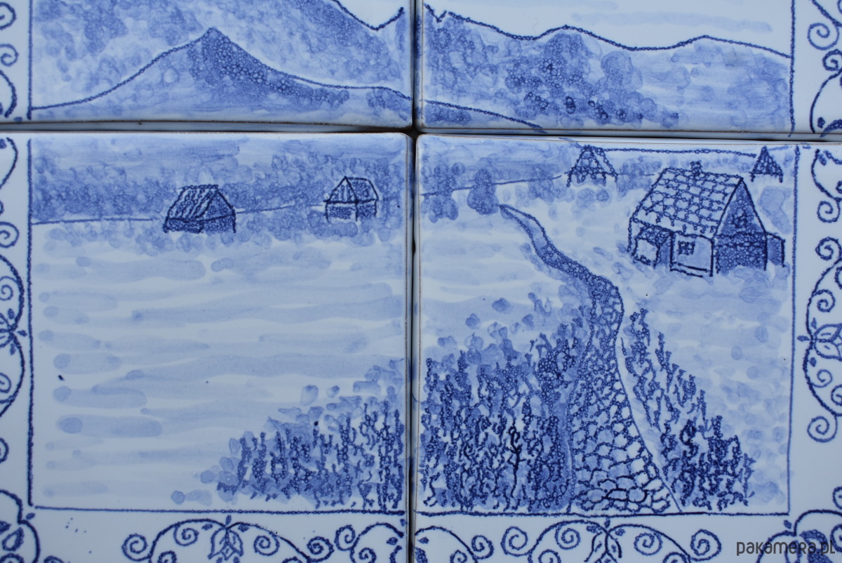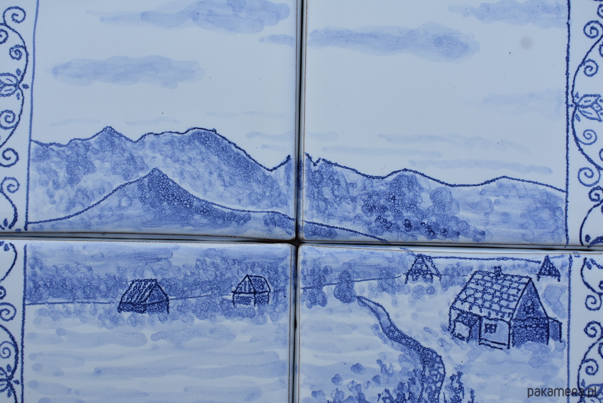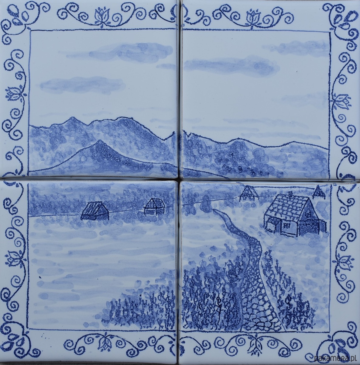 Obraz z 4 kafli (4x 15x15 cm), wymiary całości 30 X 30 cm, ręcznie malowany tlenkiem kobaltu na białym szkliwie. wypalone w temperaturze ponad 1000 stopni Celsjusza. Produkt współczesny.