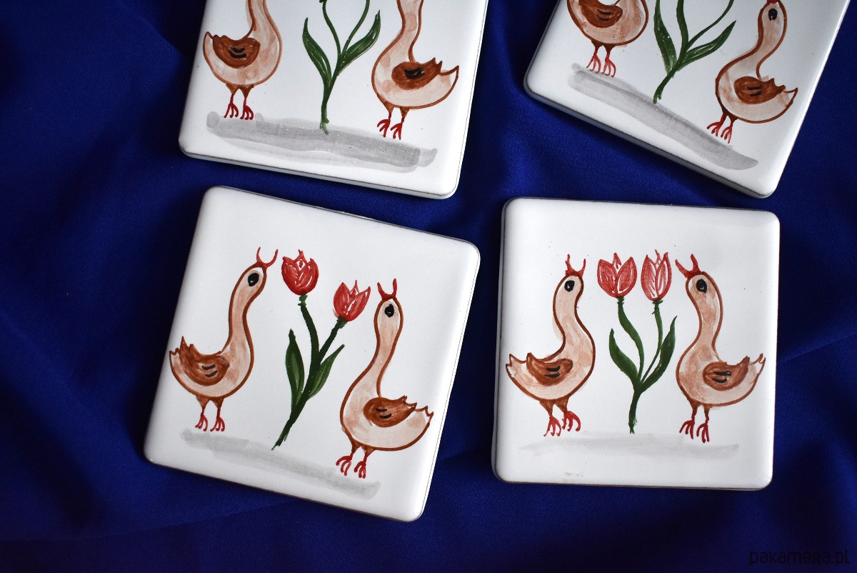Kafle o wymiarach 10 × 10 cm mają korkowe podkładki, dzięki czemu doskonale sprawdzają się jako podstawki pod gorące naczynia – miski, talerze czy imbryki. Mogą też stać się uroczą ozdobą wnętrza: powieszone na ścianie, ułożone na półce lub wykorzystane jako dekoracyjny element w kuchni.