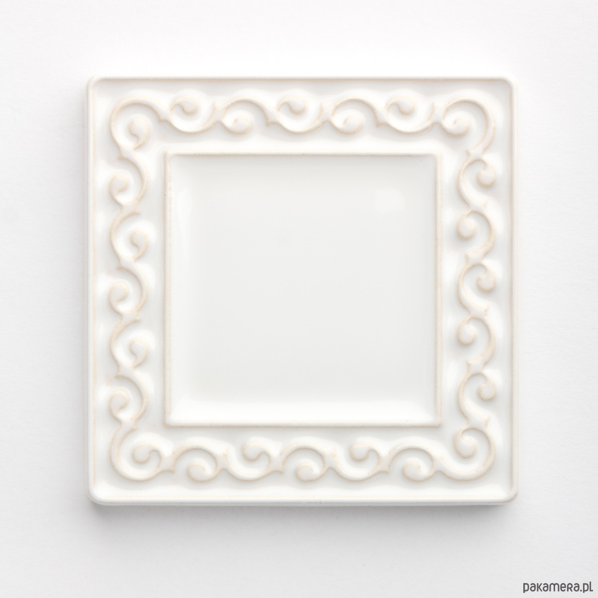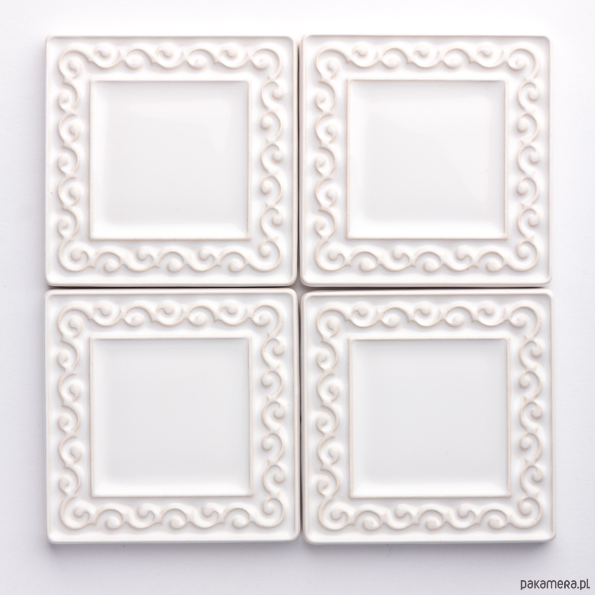 Kafle ceramiczne ręcznie robione, ścienne z lekko wypukłymi, misternymi ornamentami. Zestaw 4 kafli. Wykonane z jasnej gliny. Pokryte błyszczącym szkliwem, w sposób który odpowiednio podkreśla ozdobny wzór arabeskowej powierzchni. Dwukrotnie wypalane w wysokiej temperaturze. Odporne na wodę, ścieranie, wysokie i niskie temperatury. Montaż kafli standardowy. Na zamówienie istnieje możliwość wykonania większej ilości podobnych.
