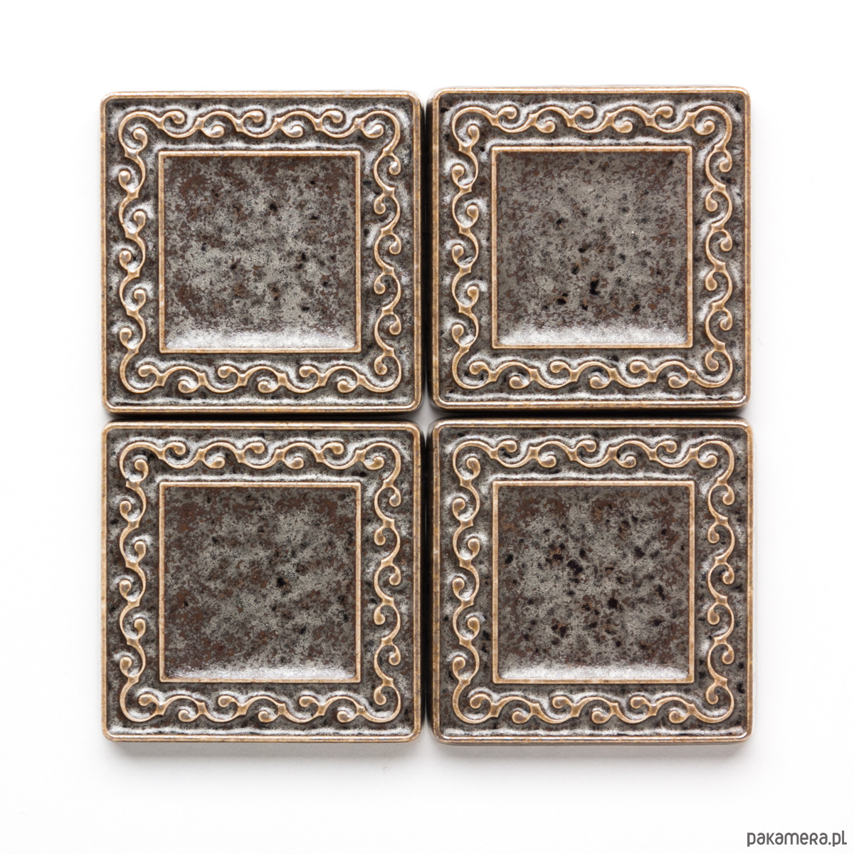 Kafle ceramiczne ręcznie robione z lekko wypukłymi, misternymi ornamentami. Zestaw 4 kafli ręcznie wykonanych z jasnej gliny, pokrytych szkliwem o satynowym połysku, dwukrotnie wypalanych w wysokiej temperaturze. Kafle są odporne na wodę, ścieranie, wysokie i niskie temperatury. Montaż jak kafli standardowych. Zastosowanie: do kuchni , do łazienki, na kominek, na ramę lustra itp. Na zamówienie istnieje możliwość wykonania większej ilości podobnych.