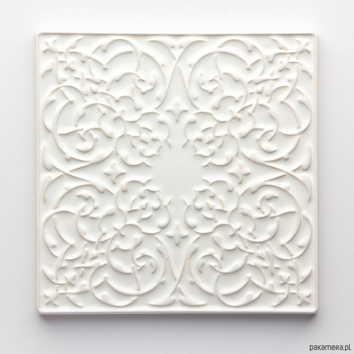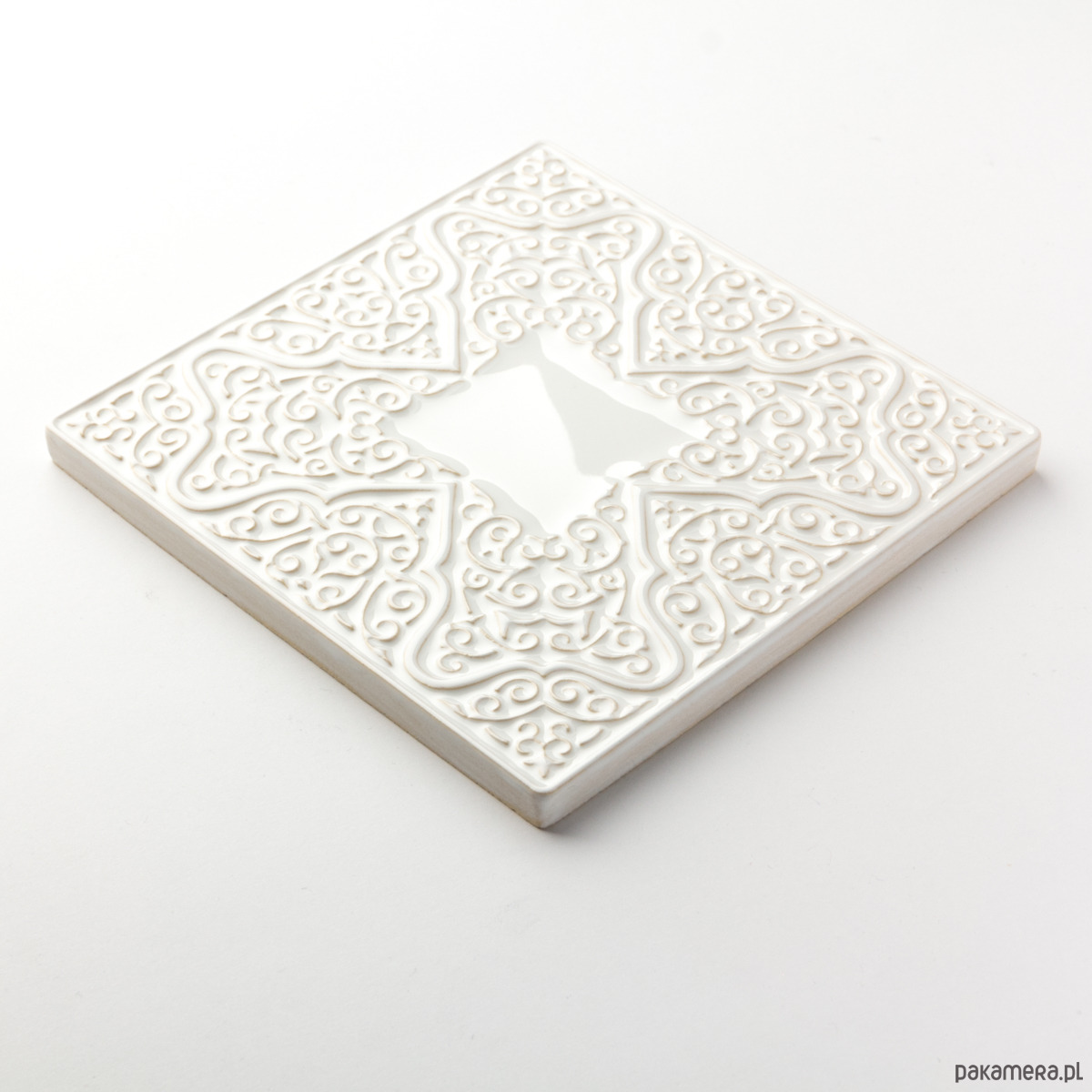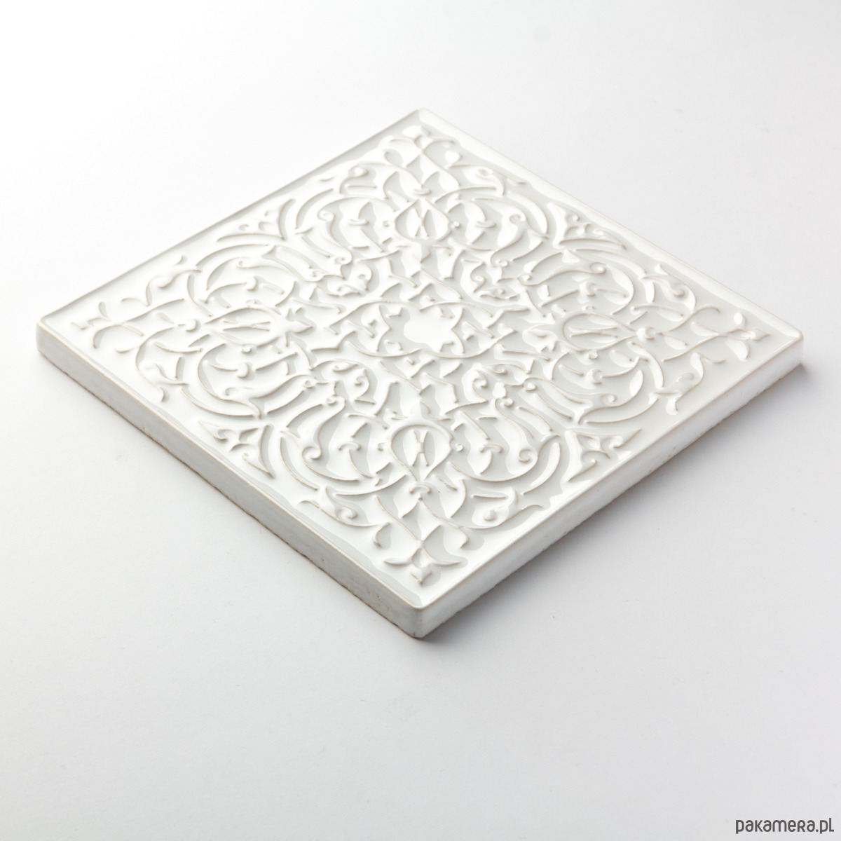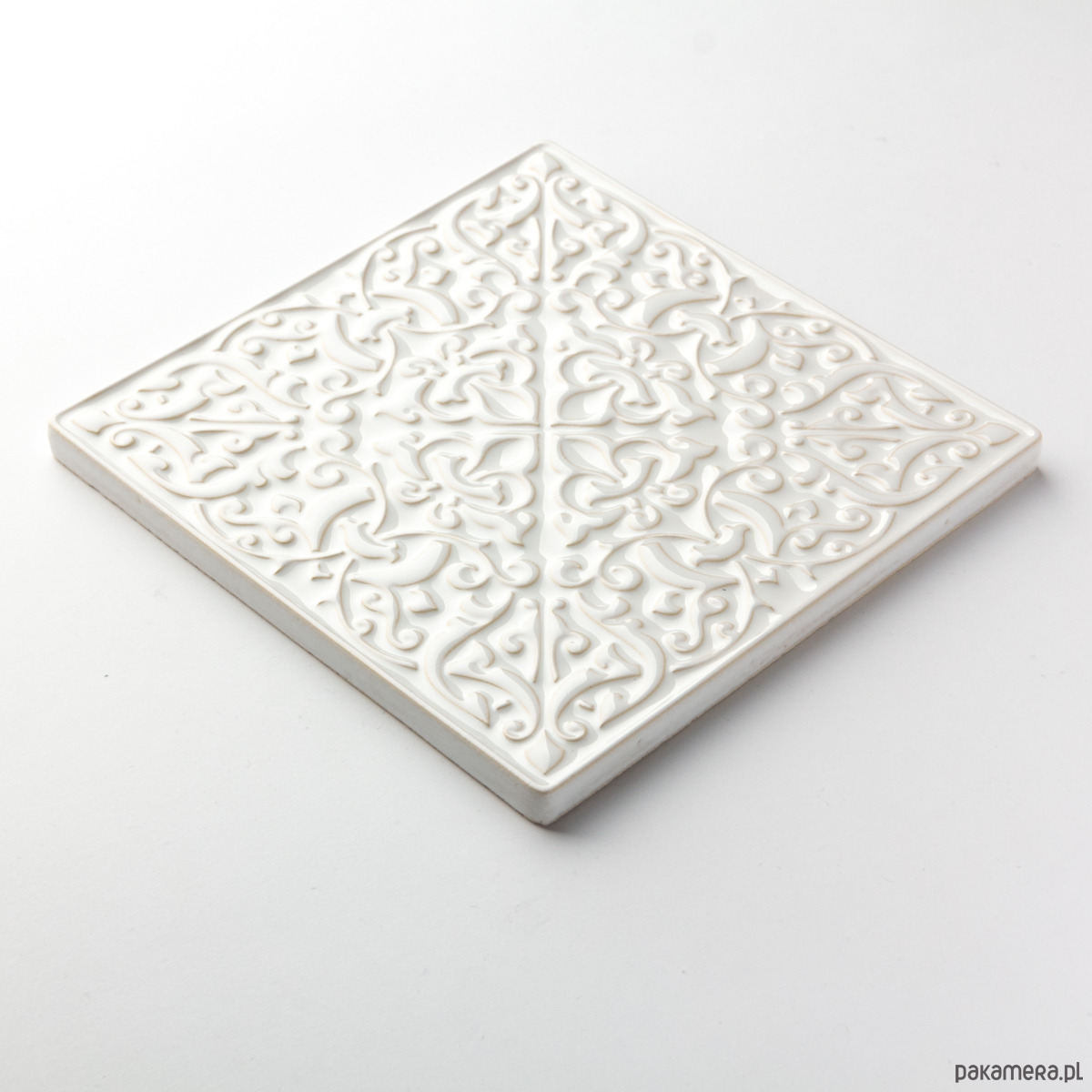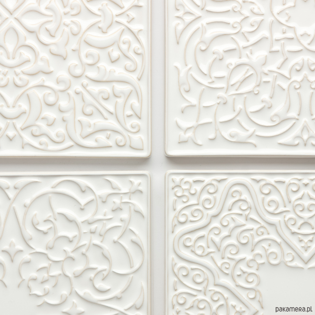 Kafle ceramiczne ręcznie robione, ścienne z lekko wypukłymi, misternymi ornamentami. Zestaw 4 kafli. Wykonane z jasnej gliny. Pokryte błyszczącym szkliwem, w sposób który odpowiednio podkreśla ozdobny wzór arabeskowej powierzchni. Dwukrotnie wypalane w wysokiej temperaturze. Odporne na wodę, ścieranie, wysokie i niskie temperatury. Montaż kafli standardowy. Na zamówienie istnieje możliwość wykonania większej ilości podobnych.