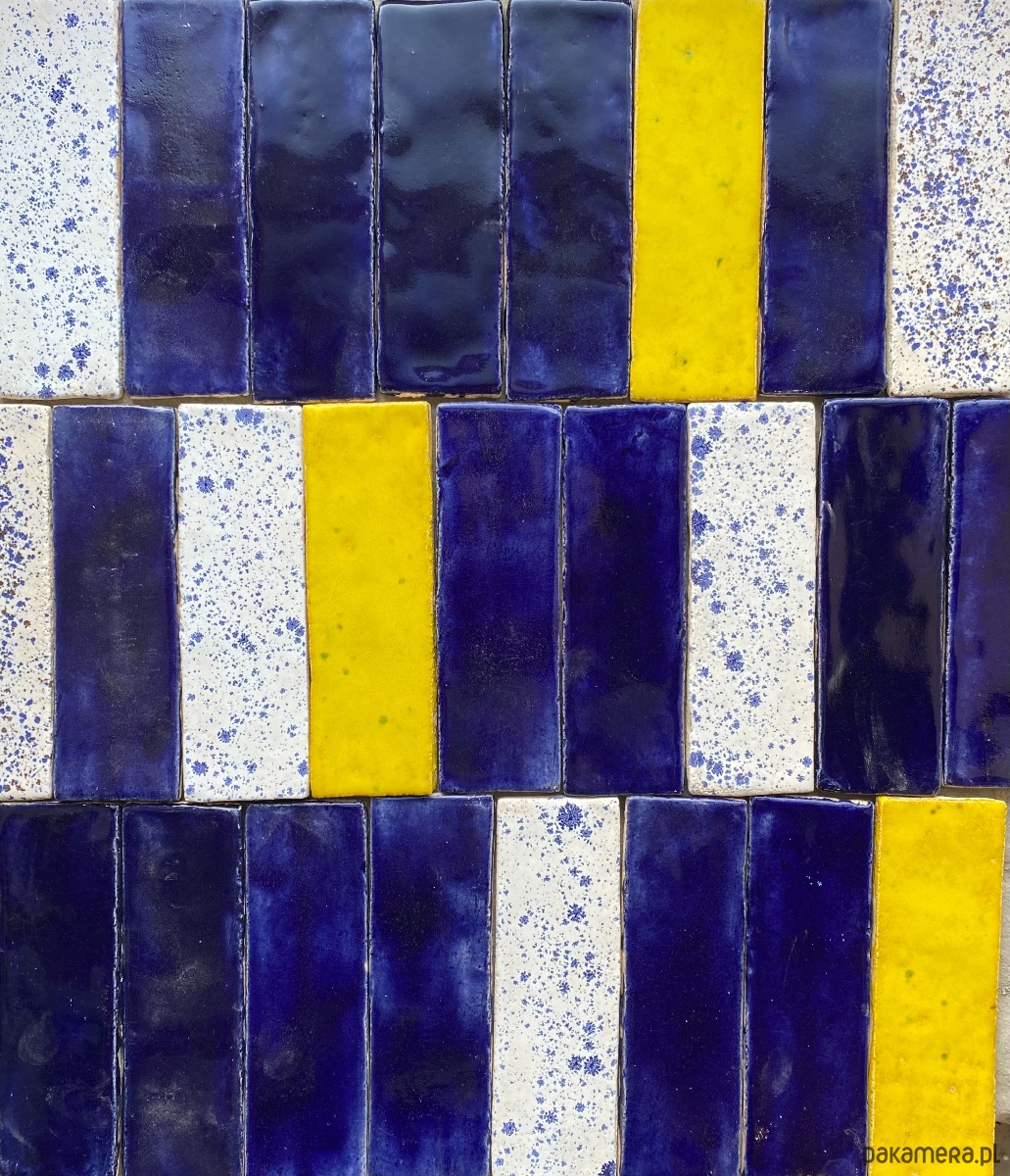 Płytki ceramiczne, ręcznie wykonane z gliny szamotowej oraz ręcznie szkliwione, rozmiar jednej płytki to ok. 6/20cm, cena dotyczy za 1m2, czas realizacji ok. 4-5 tygodni, piękny zestaw kolorów: kobalt, cytryna i nakrapiany tworzą świeżą kompozycję, która ożywi każde wnętrze, płytki jak wszystkie atkafle są odporne na temperatury, wodę, ścieralność, montaż standardowy, polecam.