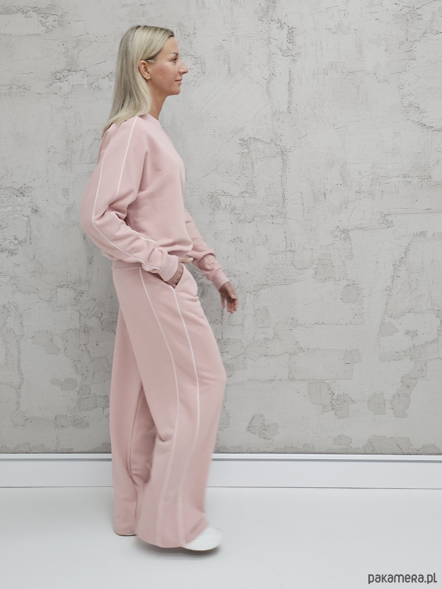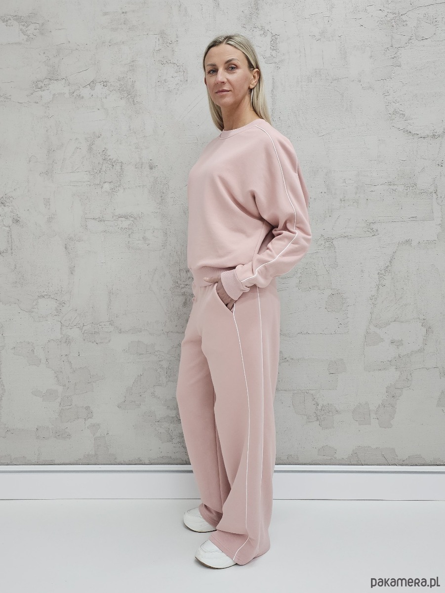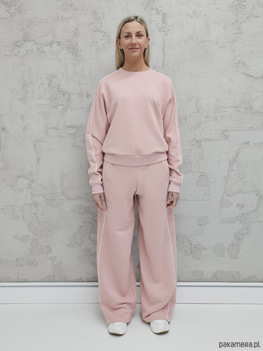 OPIS PRODUKTU- Komfortowy komplet uszyty z naszego sygnowanego materiału superSOFT™. Komplet obejmuje luźną, bardzo wygodną bluzę oraz spodnie o luźnym kroju z szerokimi nogawkami. Bluza i spodnie z lamówkami.