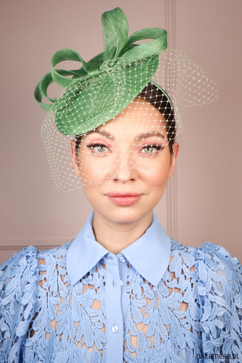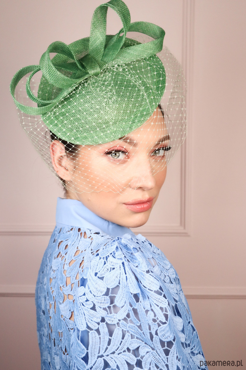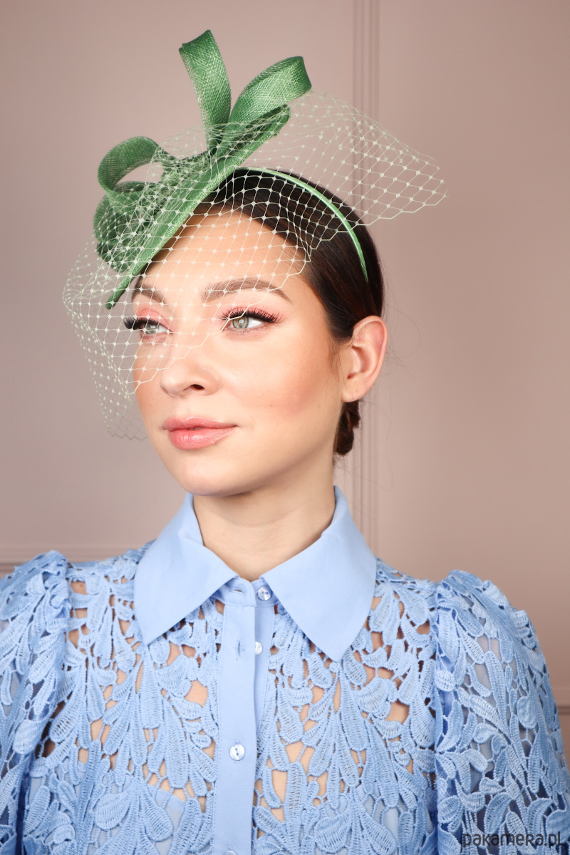 Ten urzekający hatinator, wykonany z najwyższej jakości sinamay, emanuje subtelnym urokiem w odcieniu jasnej zieleni, przywodzącej na myśl budzącą się do życia naturę. Jego sercem jest misternie ułożona kokarda, ręcznie formowana z sinamay, która dodaje mu dynamiki i niepowtarzalnego charakteru. Dopełnieniem jest dyskretna woalka, która zmysłowo otula twarz, nadając całości nutki tajemniczości i retro szyku. Woalka jaśniejsza od całości.