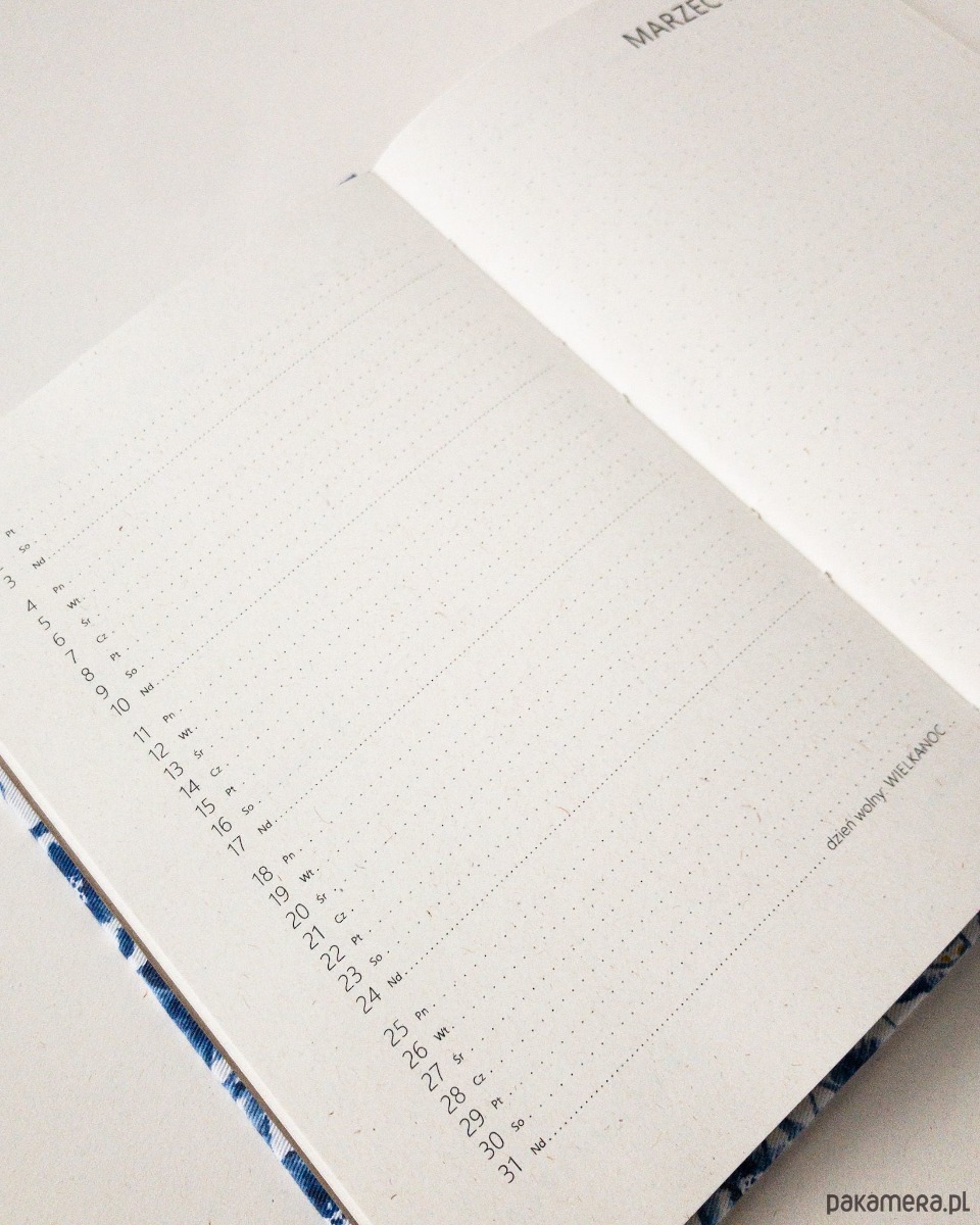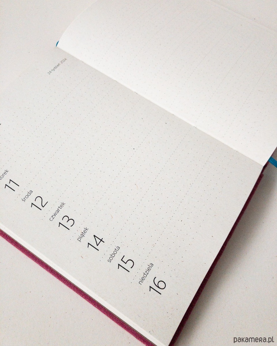 Szyty i klejony na grzbiecie, dzięki czemu idealnie otwiera się na płasko. Tygodniowe rozkładówki w kropki zaprojektowałam tak, żeby plastycznie dopasowywały się do potrzeb każdego użytkownika.