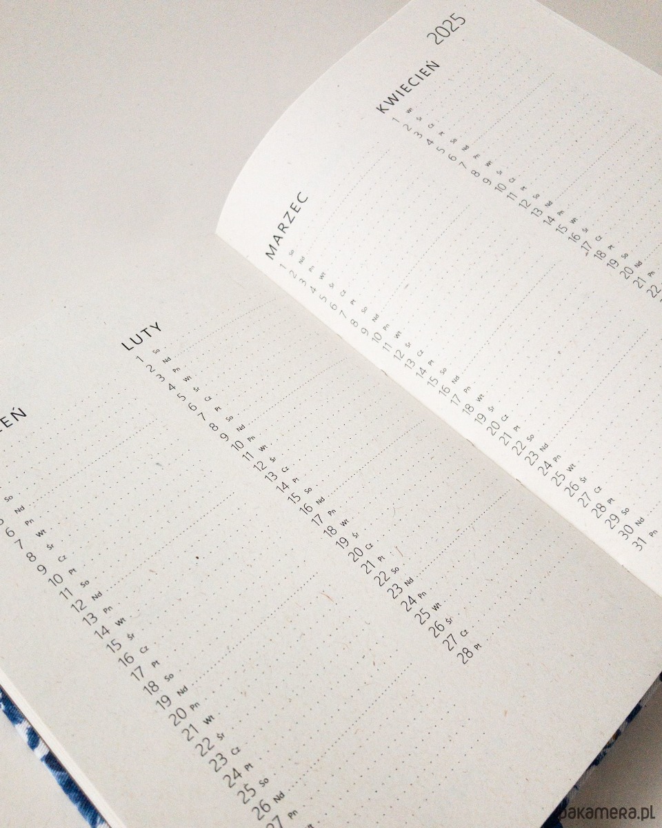 W każdym z kalendarzy na początku znajduje się dodatkowo kalendarz roczny, po każdym z miesięcy terminarz miesięczny, a na końcu skrótowy kalendarz na rok 2025