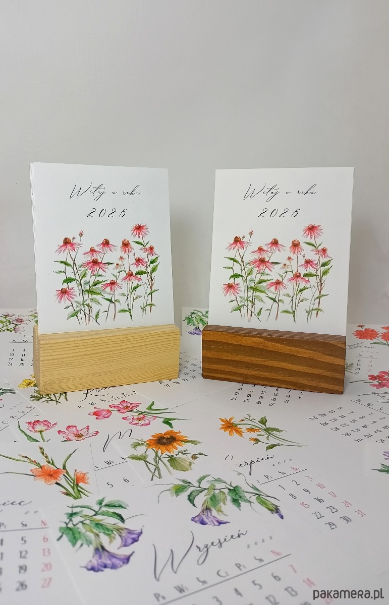 Kalendarz w formie 13 pojedynczych kart zdobionych ręcznie malowanymi kwiatowymi kompozycjami. Wydrukowany cyfrowo na fakturowanym papierze o gramaturze 250 g/m2. Drewniana podstawka w dwóch kolorach do wyboru. Podstawka zabezpieczona satynowym lakierem.