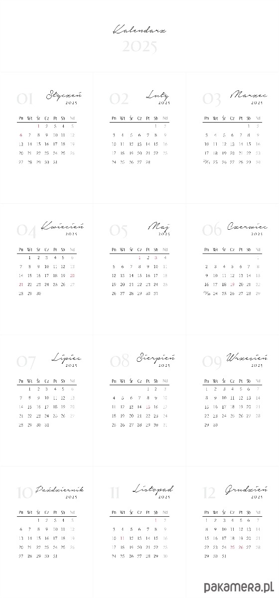 Minimalistyczny kalendarz w formie 13 pojedynczych kart. Wydrukowany cyfrowo na białym, gładkim papierze