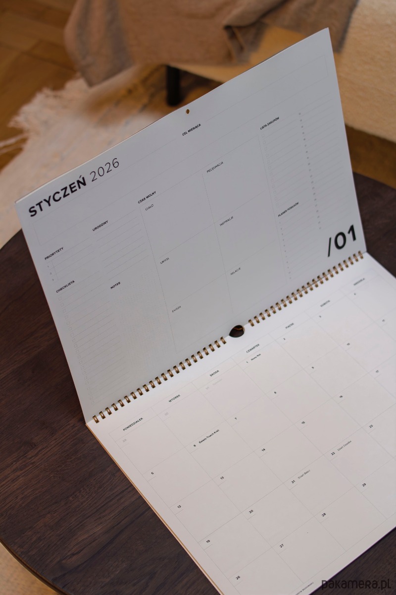 Sprawdzi się jako kalendarz rodzinny 2026 – do wspólnej organizacji obowiązków, posiłków, urodzin i wydarzeń. Będzie praktyczny dla singli i par, którzy chcą uporządkować rok. To także kalendarz dla osób z ADHD – prosty układ, duży format i przejrzyste sekcje wspierają koncentrację.