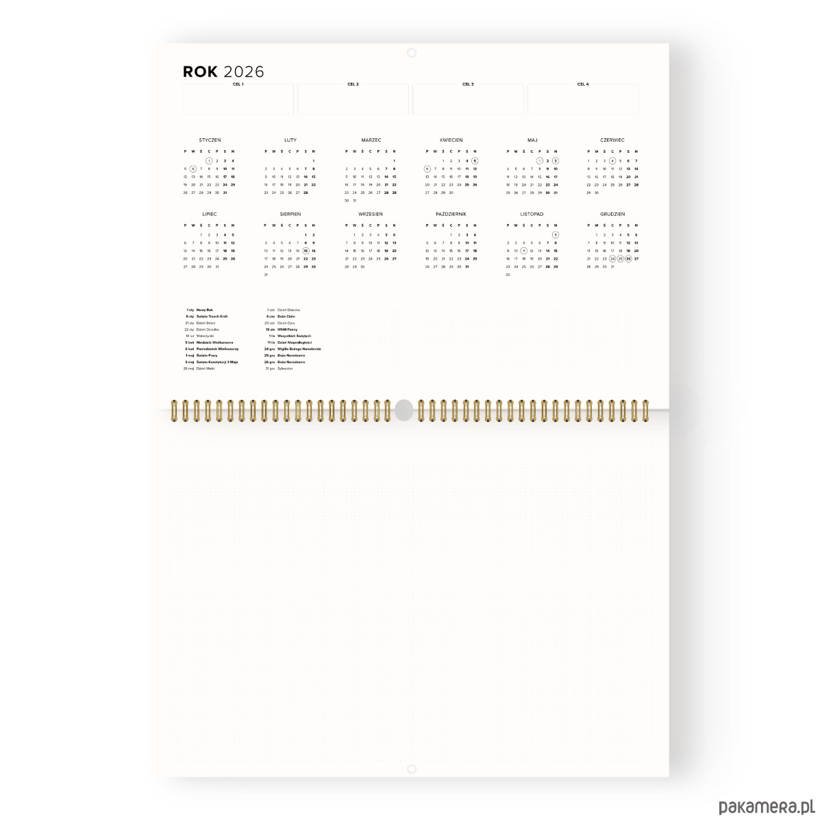 Sprawdzi się jako kalendarz rodzinny 2026 – do wspólnej organizacji obowiązków, posiłków, urodzin i wydarzeń. Będzie praktyczny dla singli i par, którzy chcą uporządkować rok. To także kalendarz dla osób z ADHD – prosty układ, duży format i przejrzyste sekcje wspierają koncentrację.