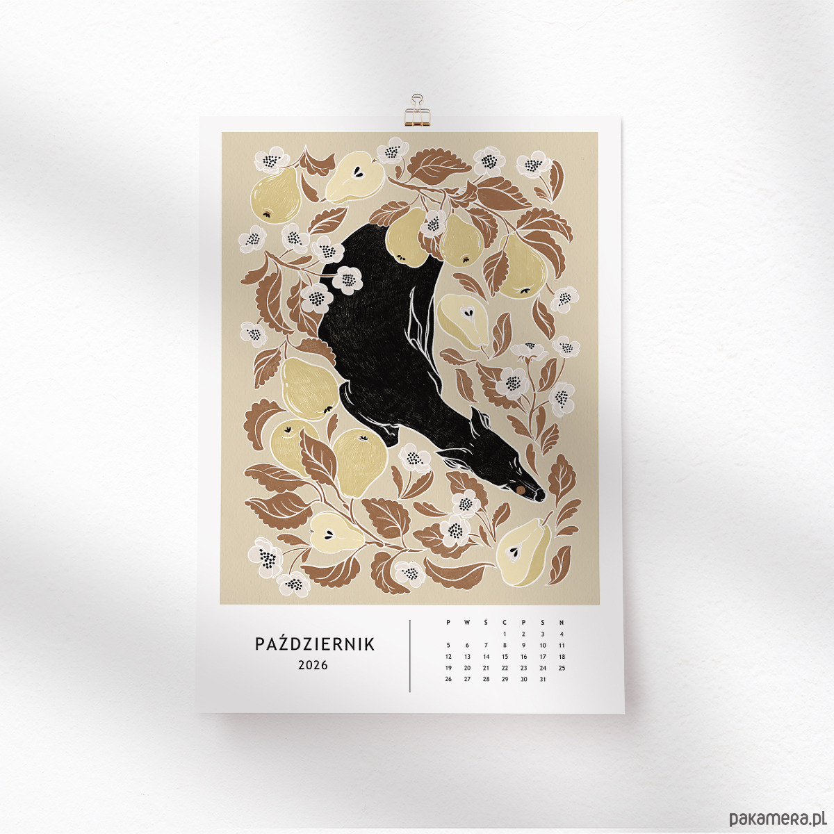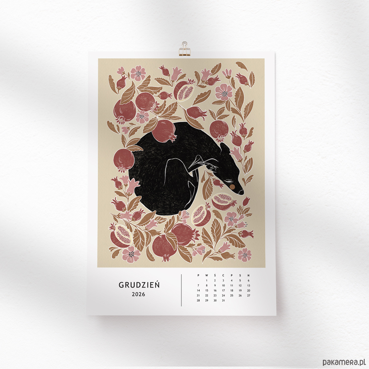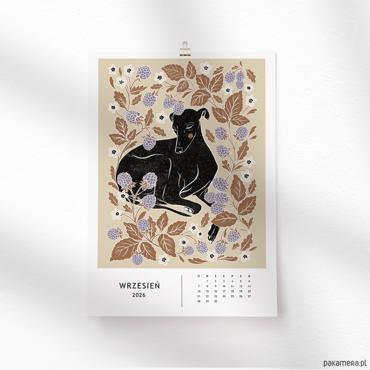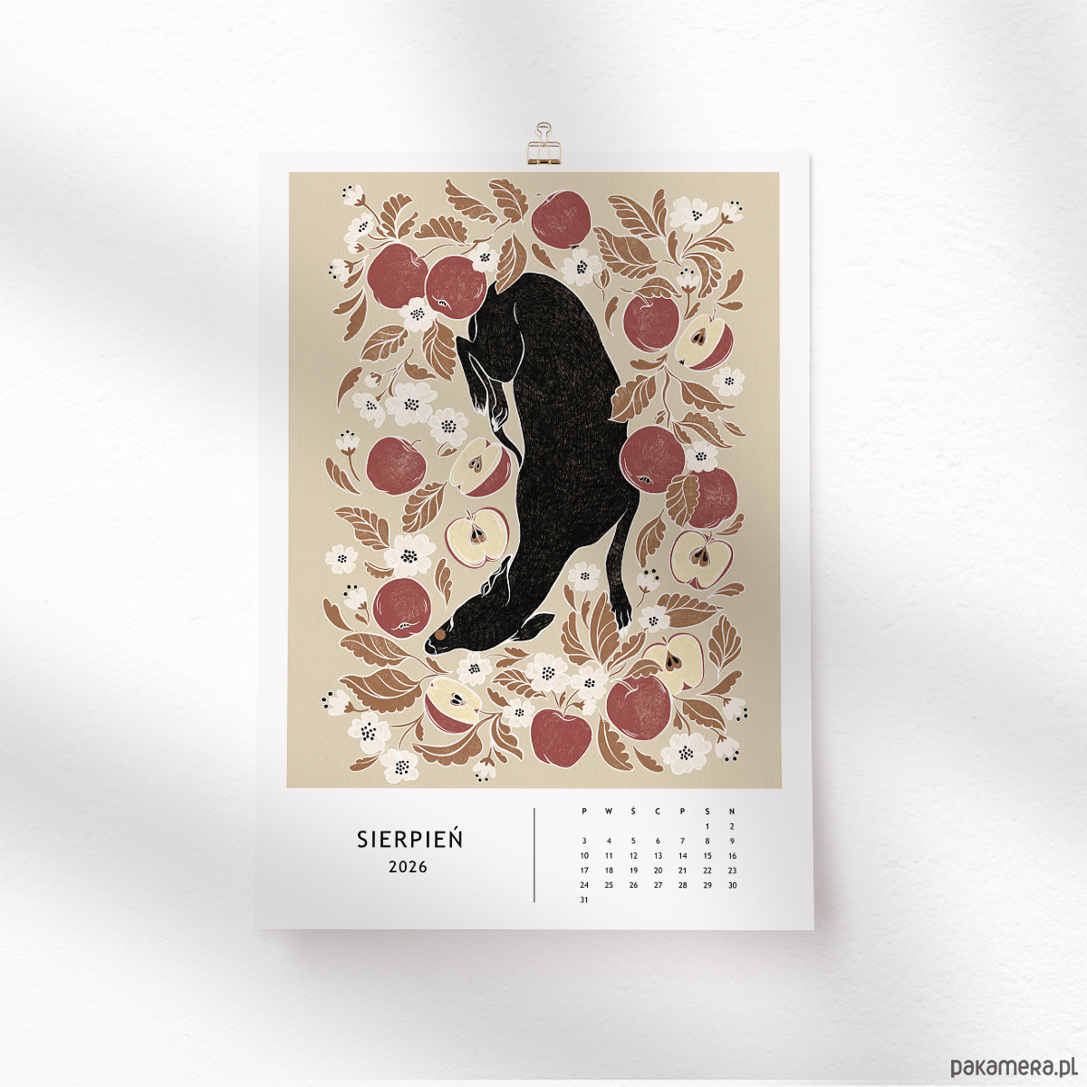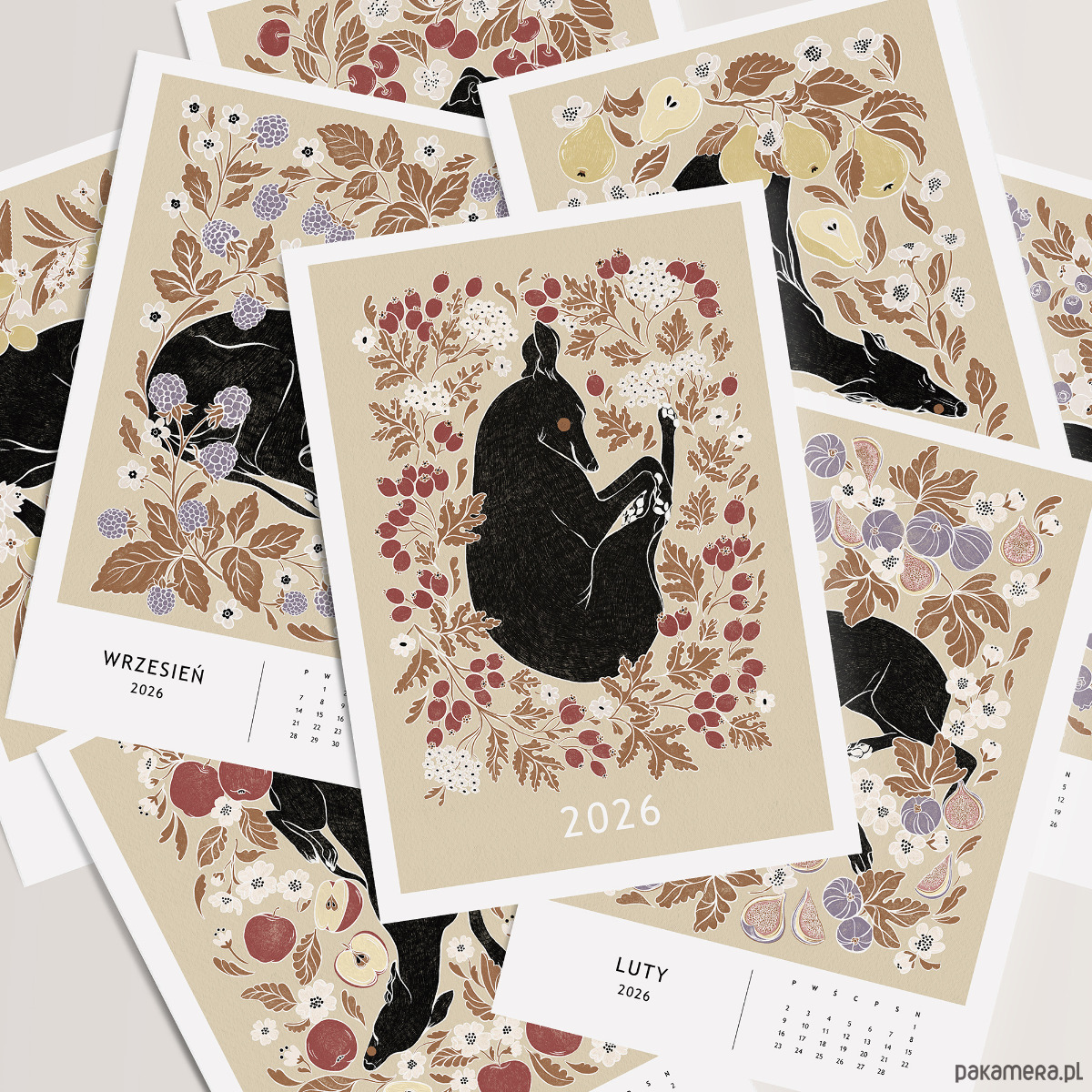 Autorski kalendarz ścienny zawierający 12 ilustracji pełnych owoców i charciej elegancji.