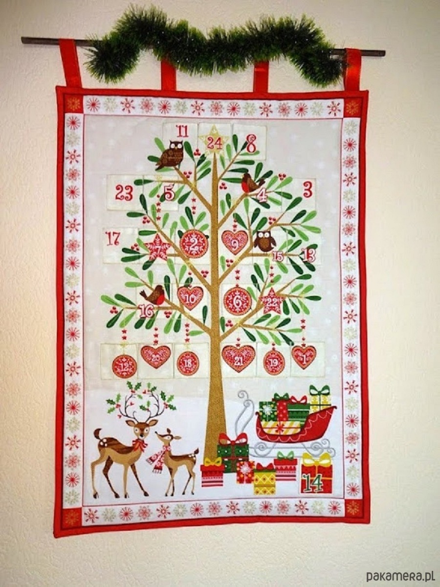 Kalendarz adwentowy z tkaniny z motywem choinki w skandynawskim stylu w kolorach szarym, czerwonym, ze złoconymi elementami.