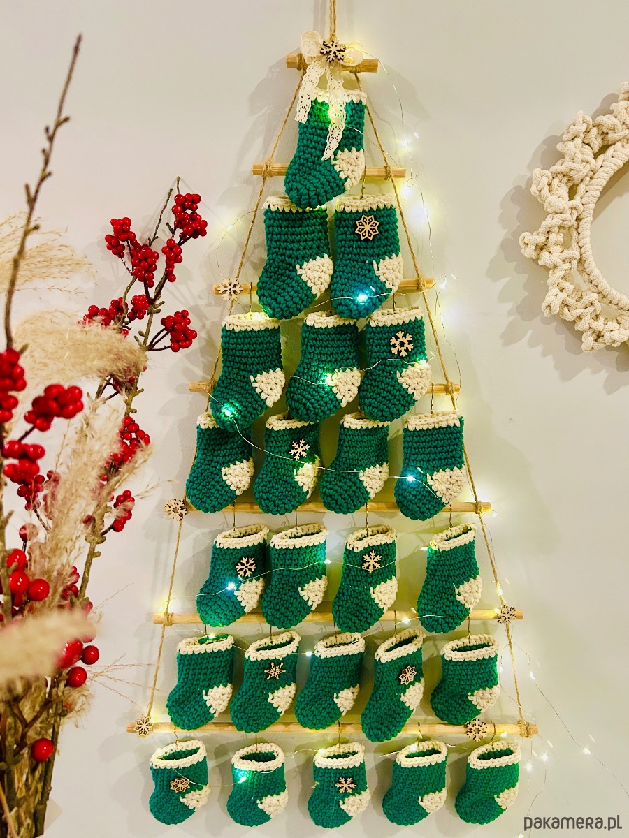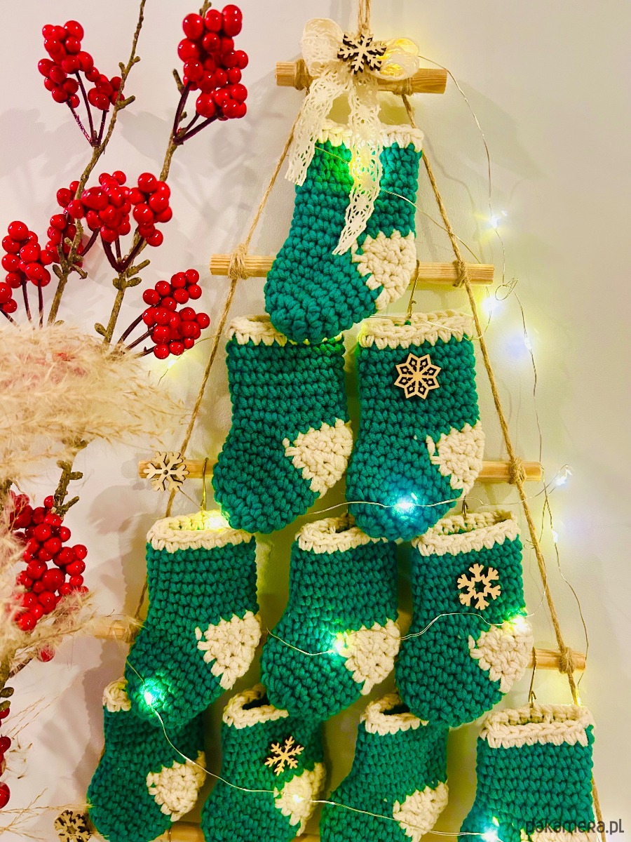 Tym razem coś wyjątkowego — wisząca choinka z małych skarpeteczek, wykonanych na szydełku które możesz wykorzystać na kilka sposobów 👇