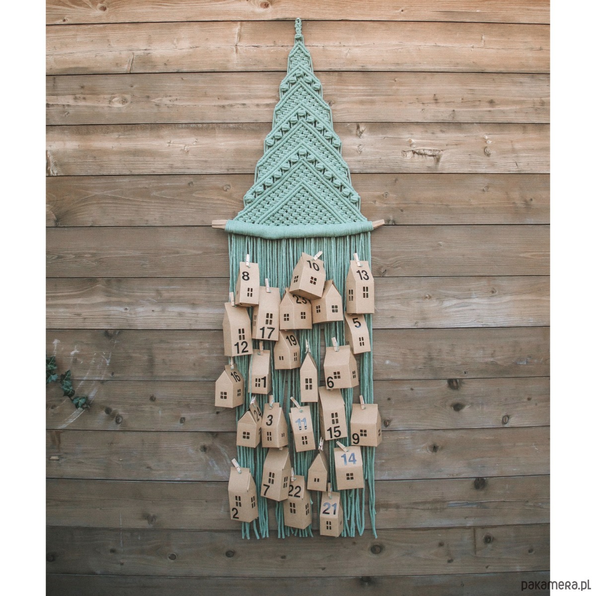 Kalendarz adwentowy z makramowym splotem.. Szerokosc w najszerszym miejscu 45cm cm i dlugi na 130cm . moze służyć jako kalendarz adwentowy a później jako dekoracja.. Zestaw z pudełkami. Kolor zielony..