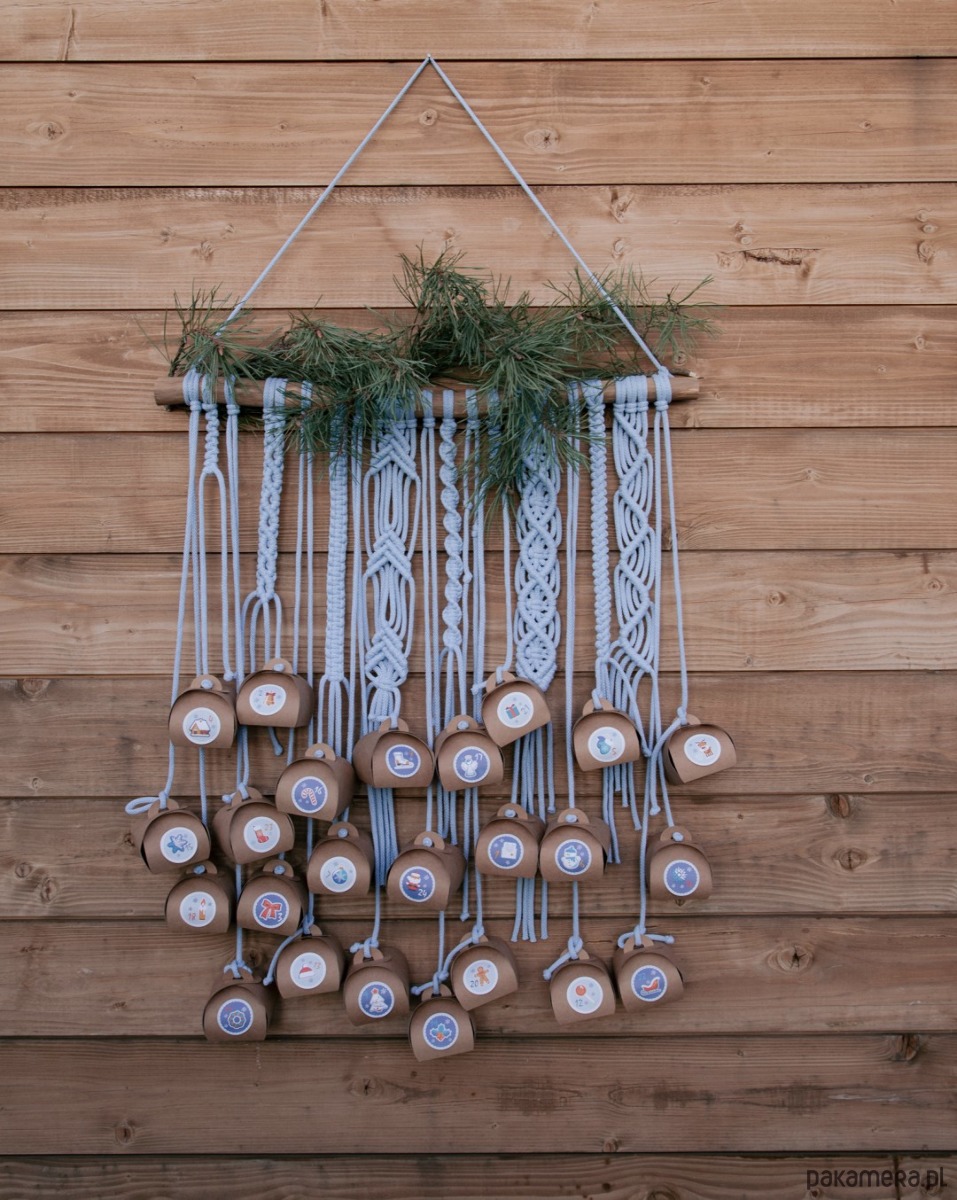 Kalendarz adwentowy wykonany metodą makramy kolor niebieski .kijek szeroki na 70 cm ..ma podwieszenia do 24 kartoników..ZESTAW to makrama, 24 pudełeczka i naklejki (cyferki z motywem świątecznym-pokazane na drugim zdjeciu ) ..drewno dębowe super współgrające z kolorem kartoników .. Do samodzielnego złożenia.. Kalendarz może służyć wiele lat.. Dostępny od reki!!