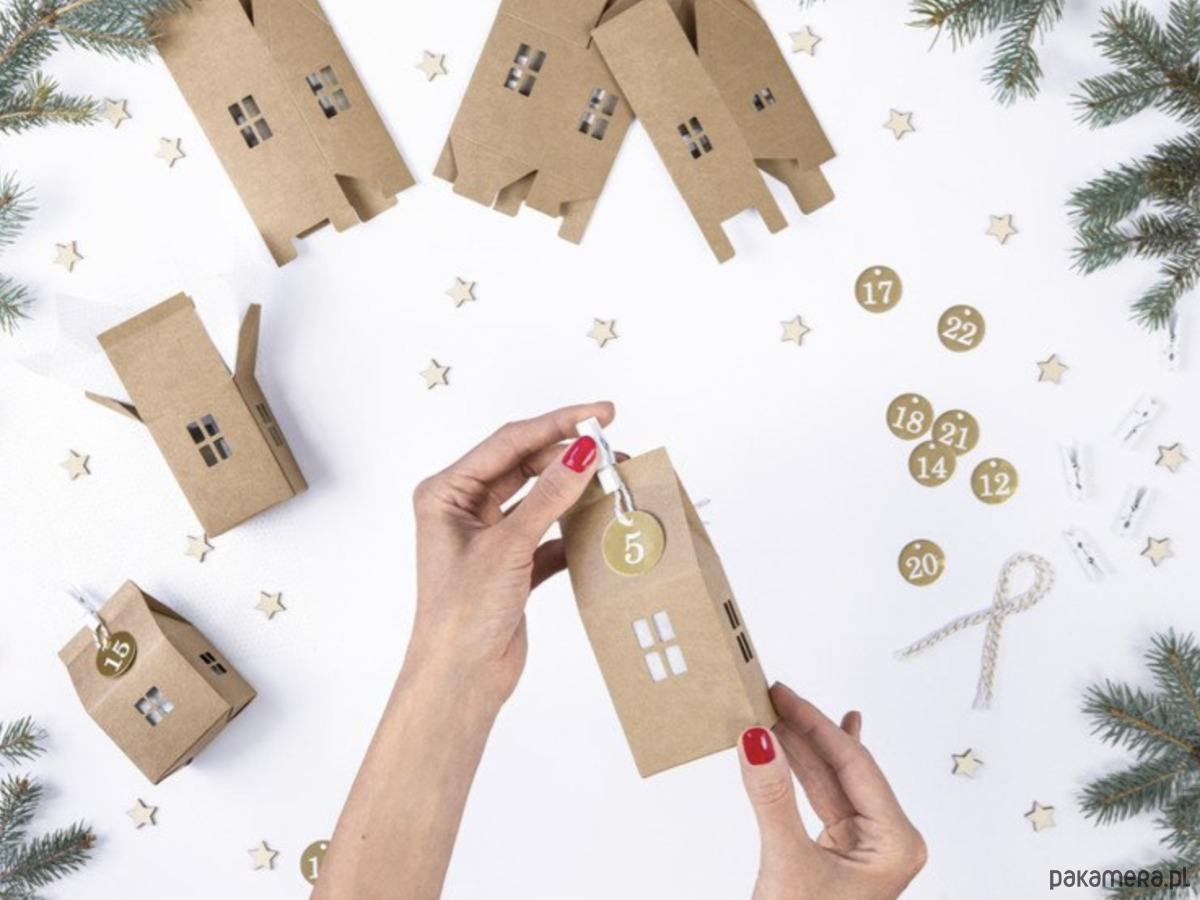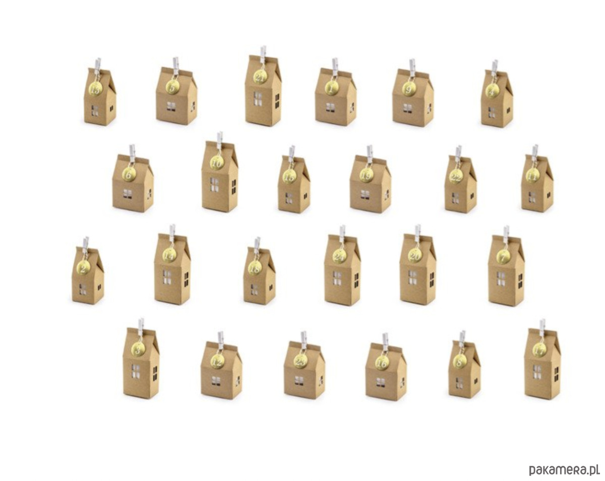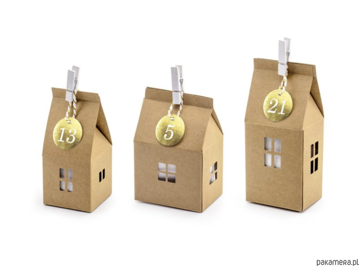 3 wzory papierowych domków w kolorze kraft, po 8 z każdego wzoru (wymiary: od ok. 5 x 11 x 5 cm do ok. 7 x 11 x 5 cm),