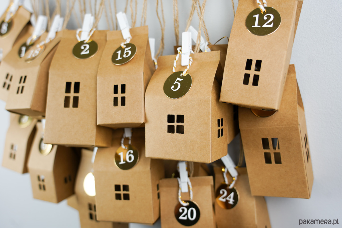 złote papierowe zawieszki z nadrukowanymi białymi cyframi od 1 do 24 (średnica ok. 3 cm),