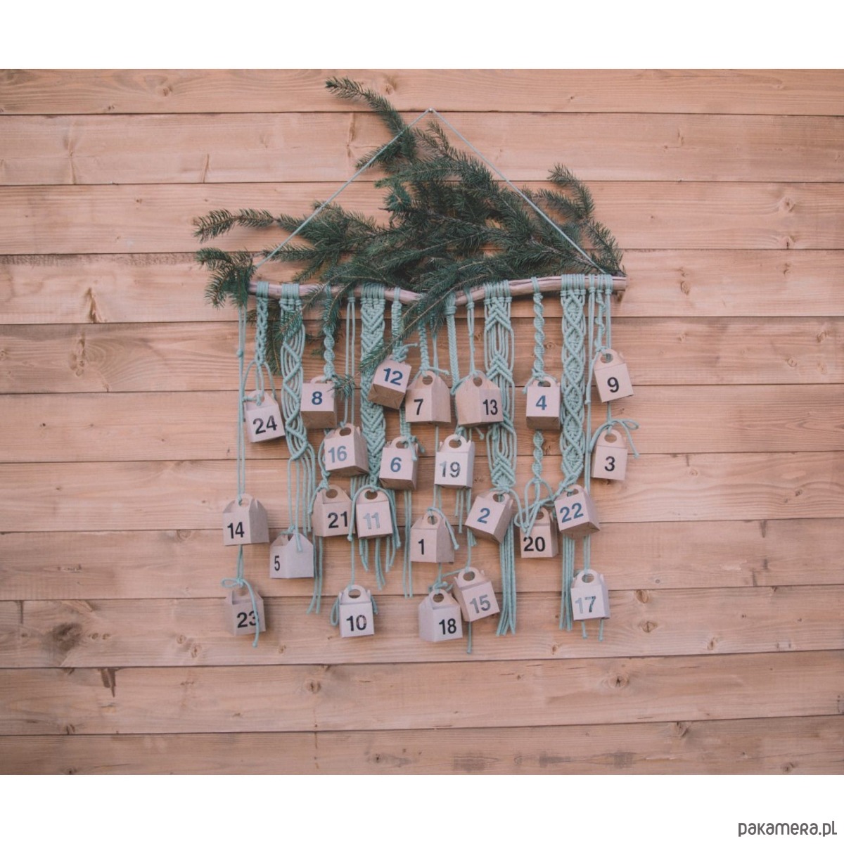 Kalendarz adwentowy wykonany metodą makramy..kijek szeroki na 65 cm .Ma podwieszenia do 24 kartoników..ZESTAW to makrama, 24 pudełeczka i naklejki ..kalendarz ze zdjecia jest przykładowy ale bedzie taki sam tylko inny kijek