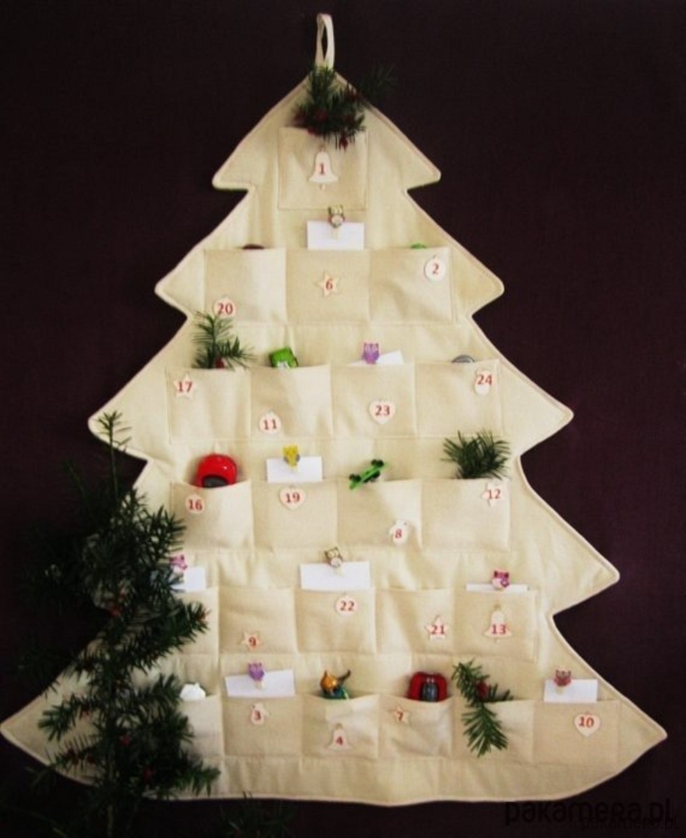 Kalendarz adwentowy w kształcie choinki, wykonany z surowej tkaniny bawełnianej ,usztywniony. Na górze pętelka do zawieszenia.