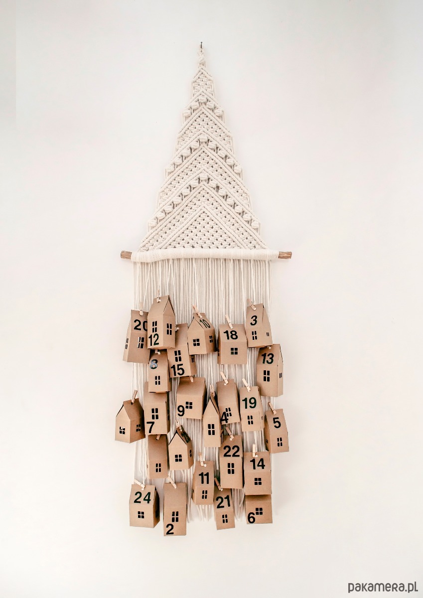 Kalendarz adwentowy z makramowym splotem.. Szerokosc w najszerszym miejscu 45cm cm i dlugi na 130cm . moze służyć jako kalendarz adwentowy a później jako dekoracja.. Zestaw z pudełkami. Kolor naturalnej bieli (nie śnieżnobiały) .