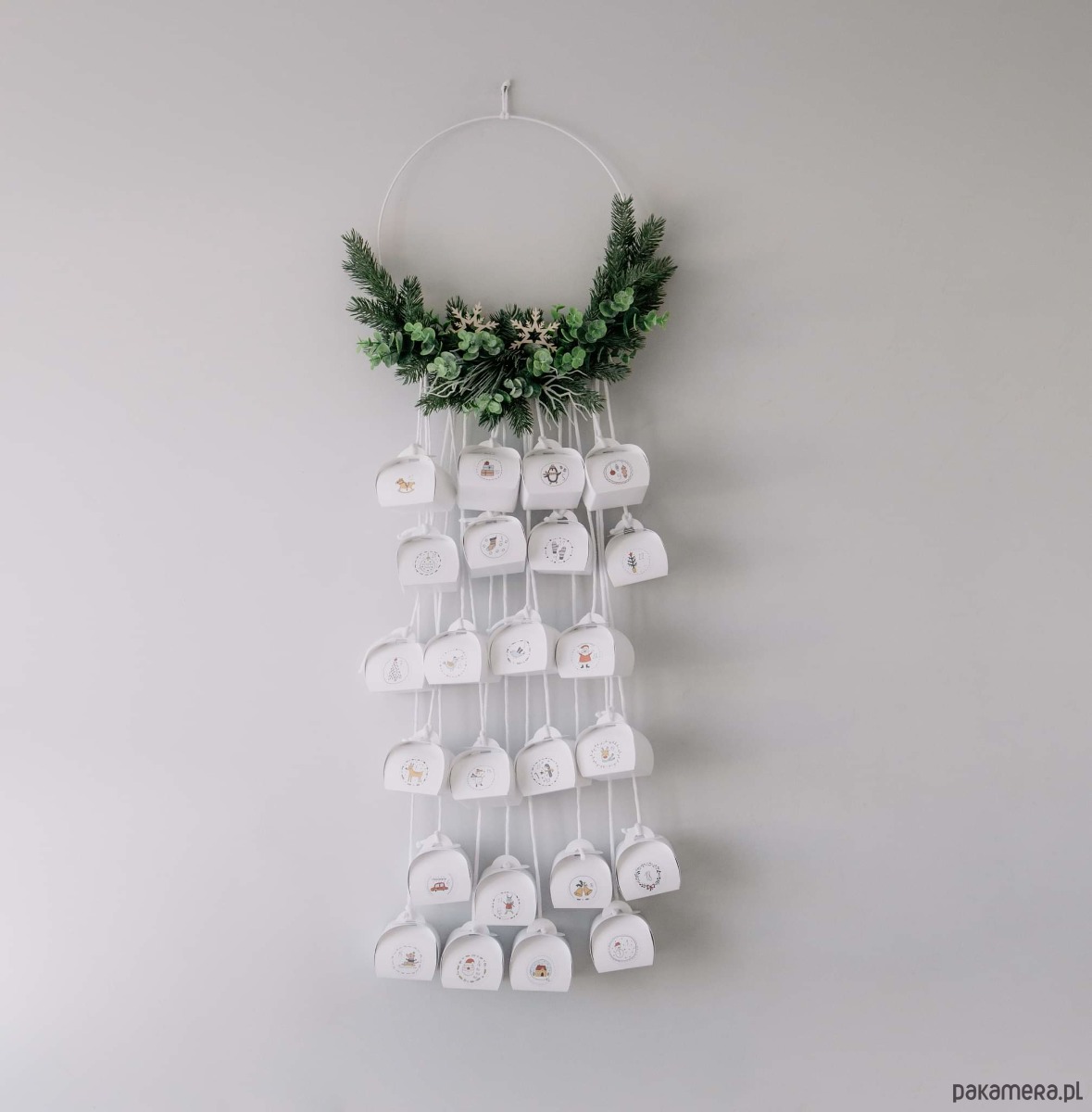Jedyny.. Niepowtarzalny egzemplarz.. Kalendarz adwentowy w formie stroika .. Obrecz 30 cm... moze sluzyc jako kalendarz adwentowy a później jako dekoracja.. Zestaw z pudełkami i naklejkami (pudełka biale a naklejki jak na drugim zdjeciu).. Dostępny od ręki!!!