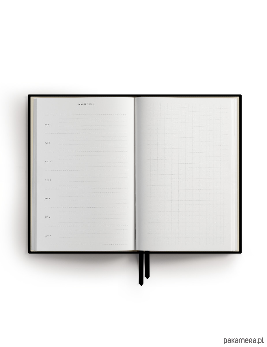 Wewnątrz: Rozkładówka na rok 2024 i 2025; układ tygodniowy poziomy; ogólny plan 12 miesięcy na rok 2024 i 2025; notatnik w kratkę, dwie zakładki wykonane z tasiemki, kieszonka