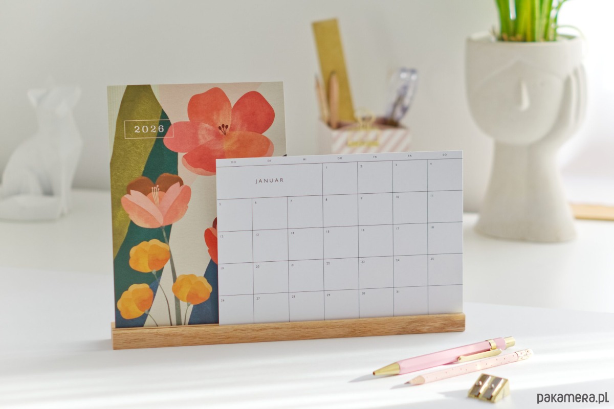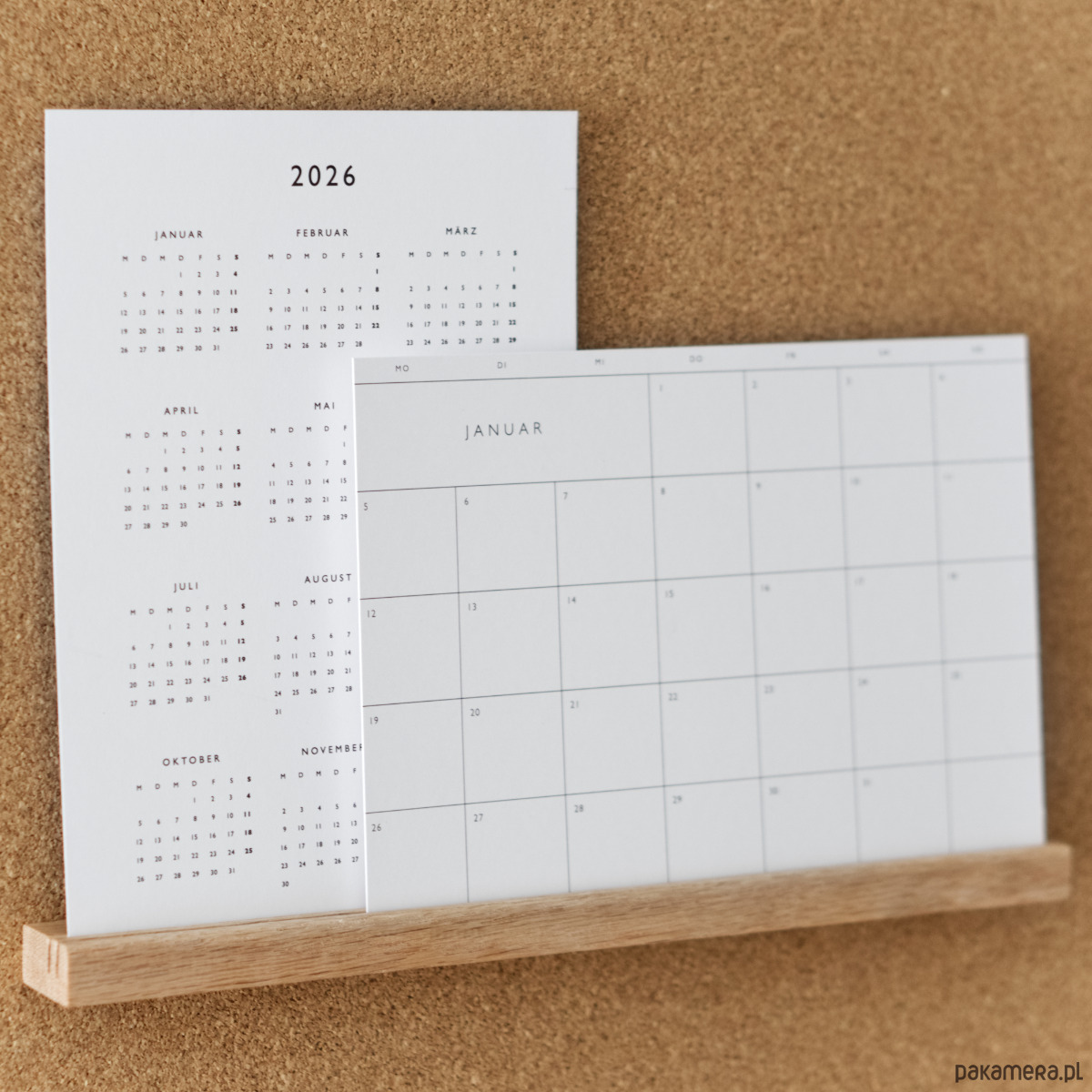 Kalendarz biurkowy na 2026 rokTen miesięczny planer w formacie A5 zawiera 6 dwustronnych kart premium (300 gsm) — po jednym miesiącu na każdej stronie. Każda minimalistyczna strona kalendarza oferuje miejsce na codzienne notatki, wydarzenia, święta i urodziny, z całym miesiącem na jednej stronie.Dodatkowa karta A5 z ilustracją botaniczną i rocznym kalendarzem na 2026 rok dodaje stylowego akcentu i pomaga ogarnąć cały rok w jednym miejscu.Kalendarz jest wyposażony w solidną podstawkę z naturalnego dębu — piękną, stabilną i wielokrotnego użytku. Możesz postawić ją na biurku lub zawiesić na ścianie dzięki dyskretnym otworom montażowym z tyłu. Idealny do nowoczesnego miejsca pracy, domowego biura lub jako przemyślany prezent dla miłośników planowania i minimalizmu.Szczegóły:6 dwustronnych kart A5