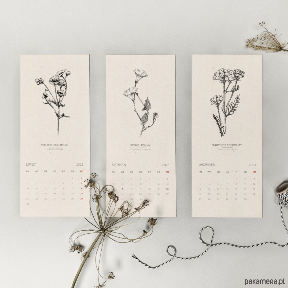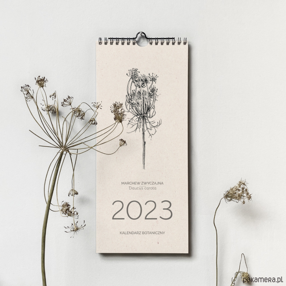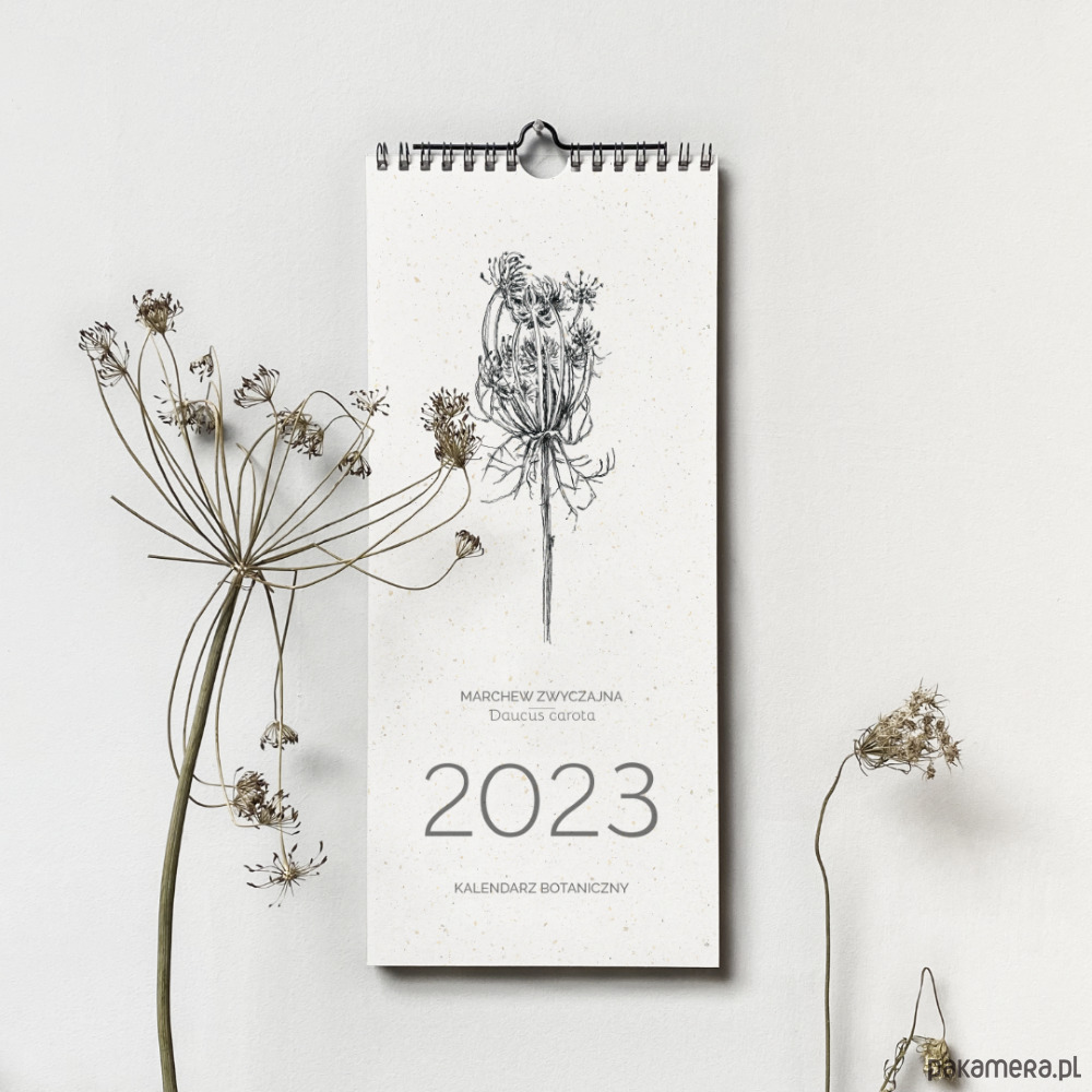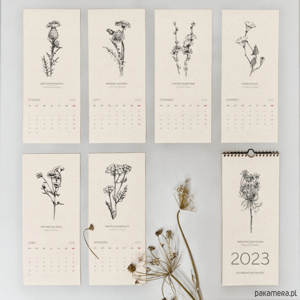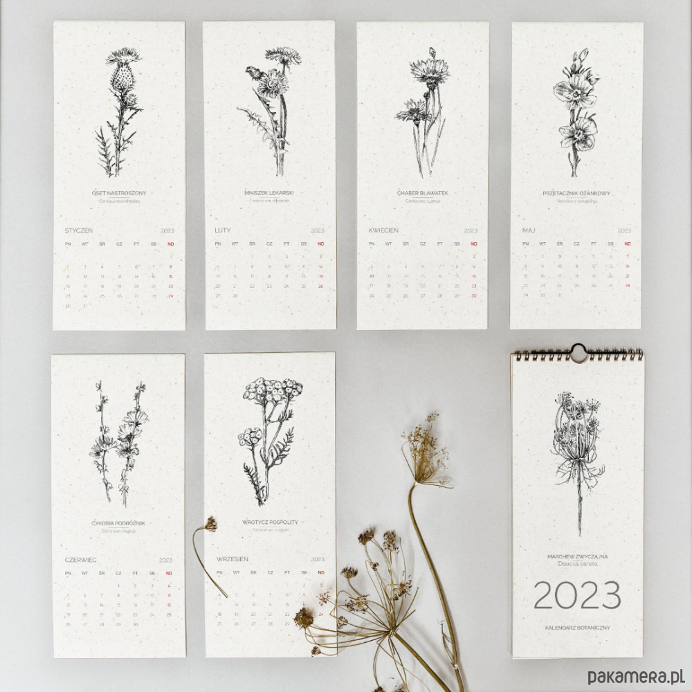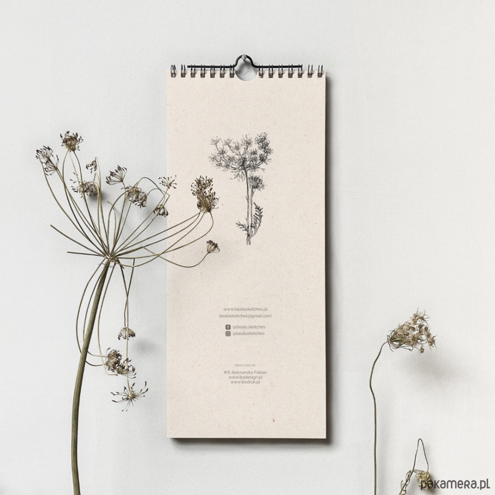 Kalendarz botaniczny w stylu minimalistycznym, składający się z 13 grafik przedstawiających rośliny. Oryginalne grafiki zostały wykonane rapidografem i tuszem. Każda karta posiada kalendarium na jeden miesiąc oraz podpisany rysunek roślinki w języki polskim i po łacinie.