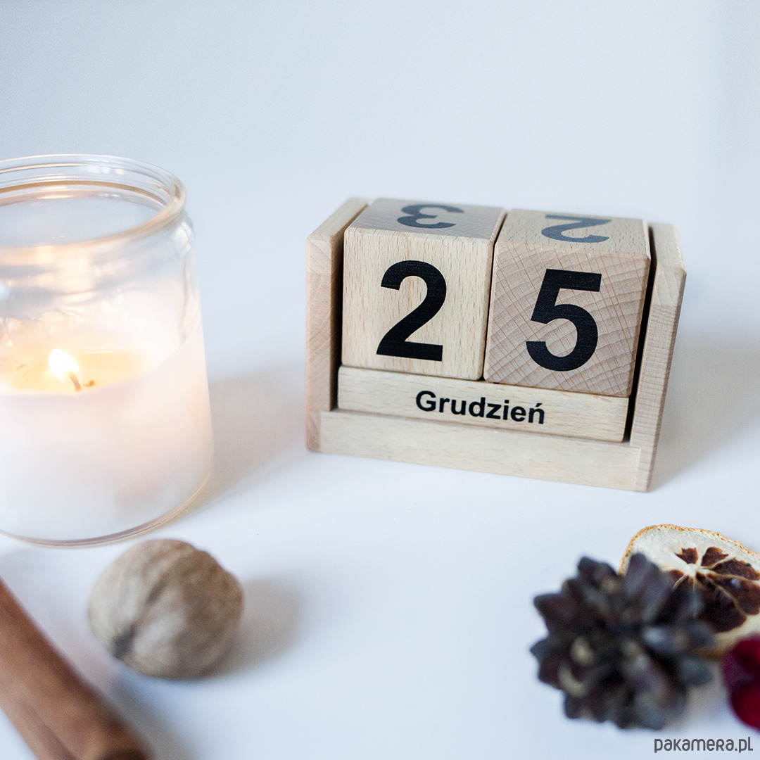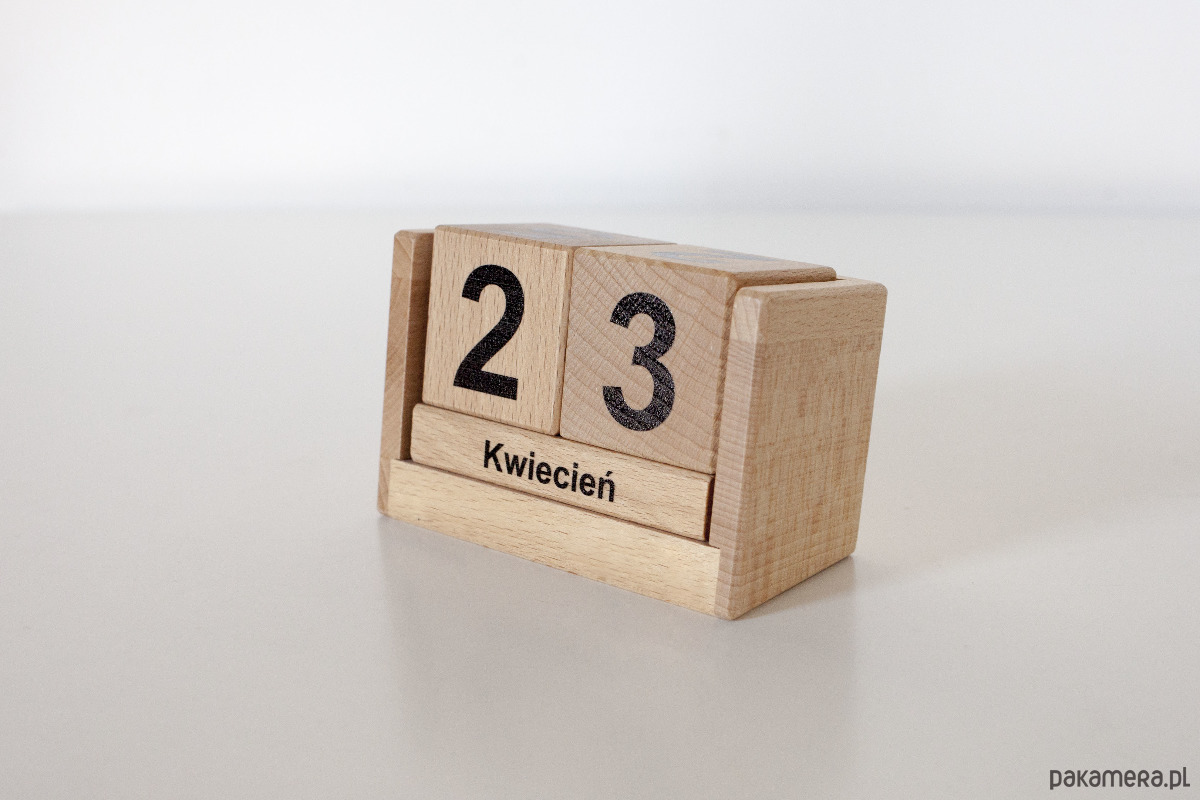 Kalendarz składa się z drewnianej podstawki, 3 belek z miesiącami oraz z 2 sześcianów z cyframi. Wymiary: 11cm x 5.5cm x 7 cm