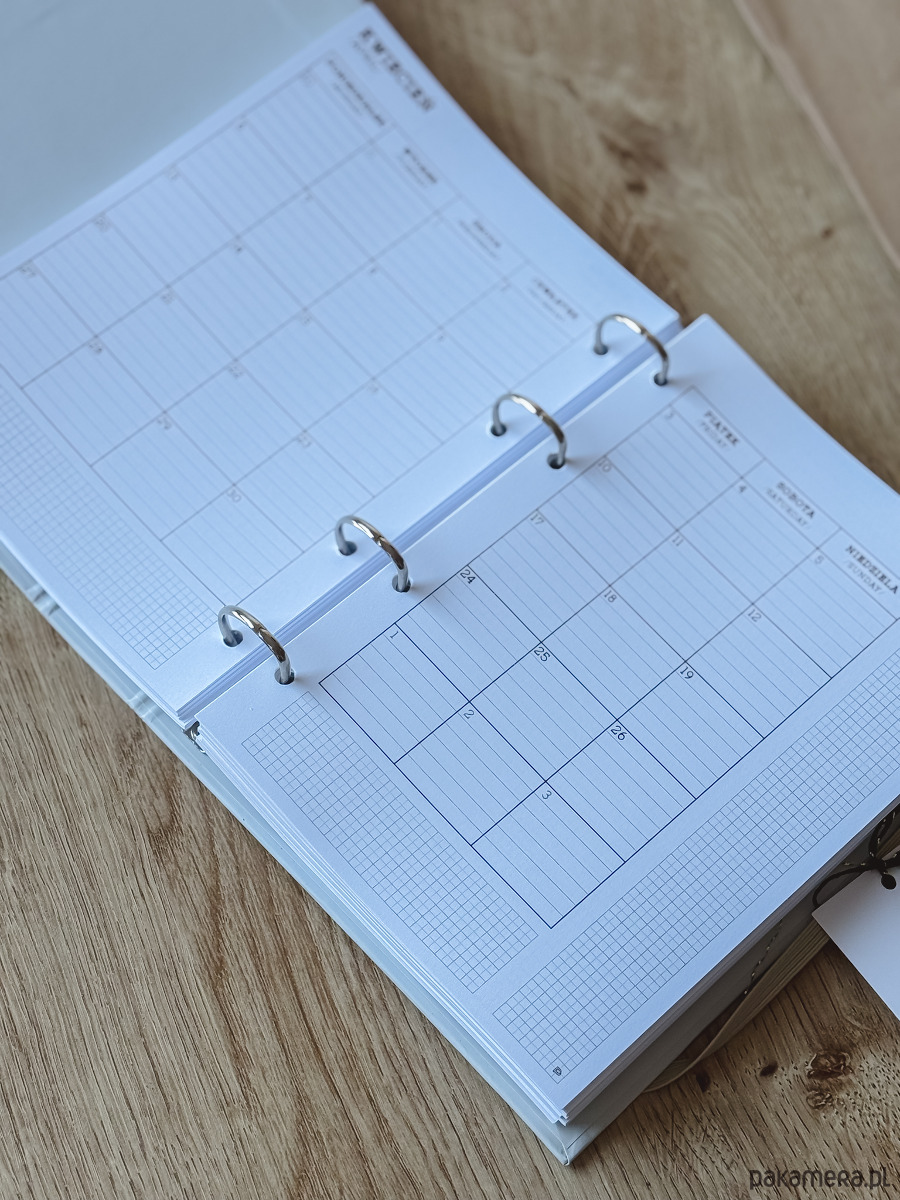Kalendarz dzienny jest przygotowany ciągiem - dzień po dniu, a pomiędzy miesiącami pojawia się tabelka miesięczna.